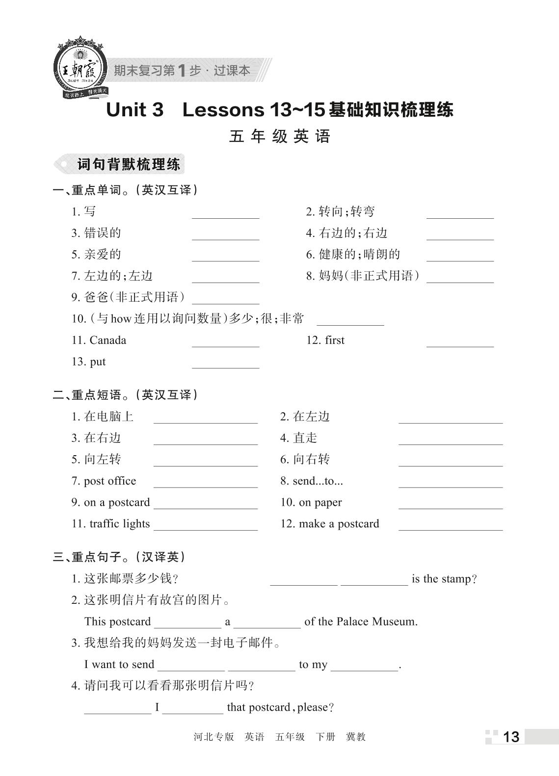 王朝霞期末过课本——Unit 3 Lessons 13~15基础知识梳理练五年级下册英语(冀教版)