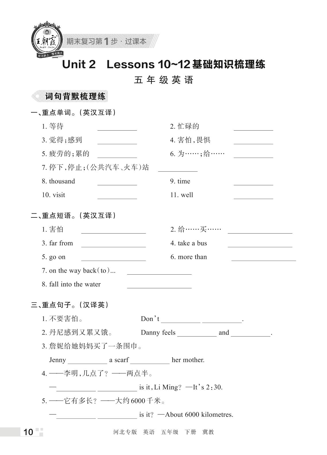 王朝霞期末过课本——Unit 2 Lessons 10~12基础知识梳理练五年级下册英语(冀教版)