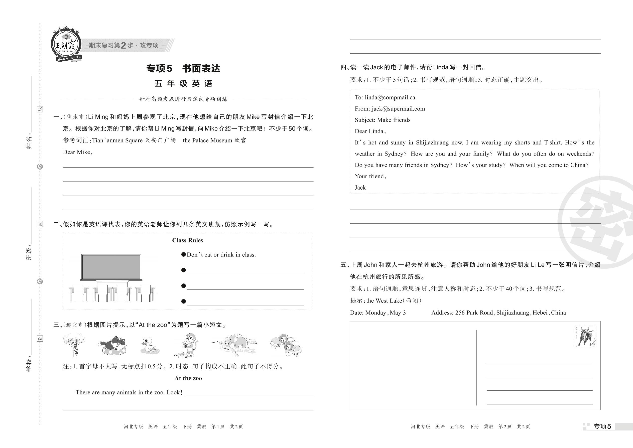 王朝霞期末专项卷——书面表达五年级下册英语(冀教版)【5】