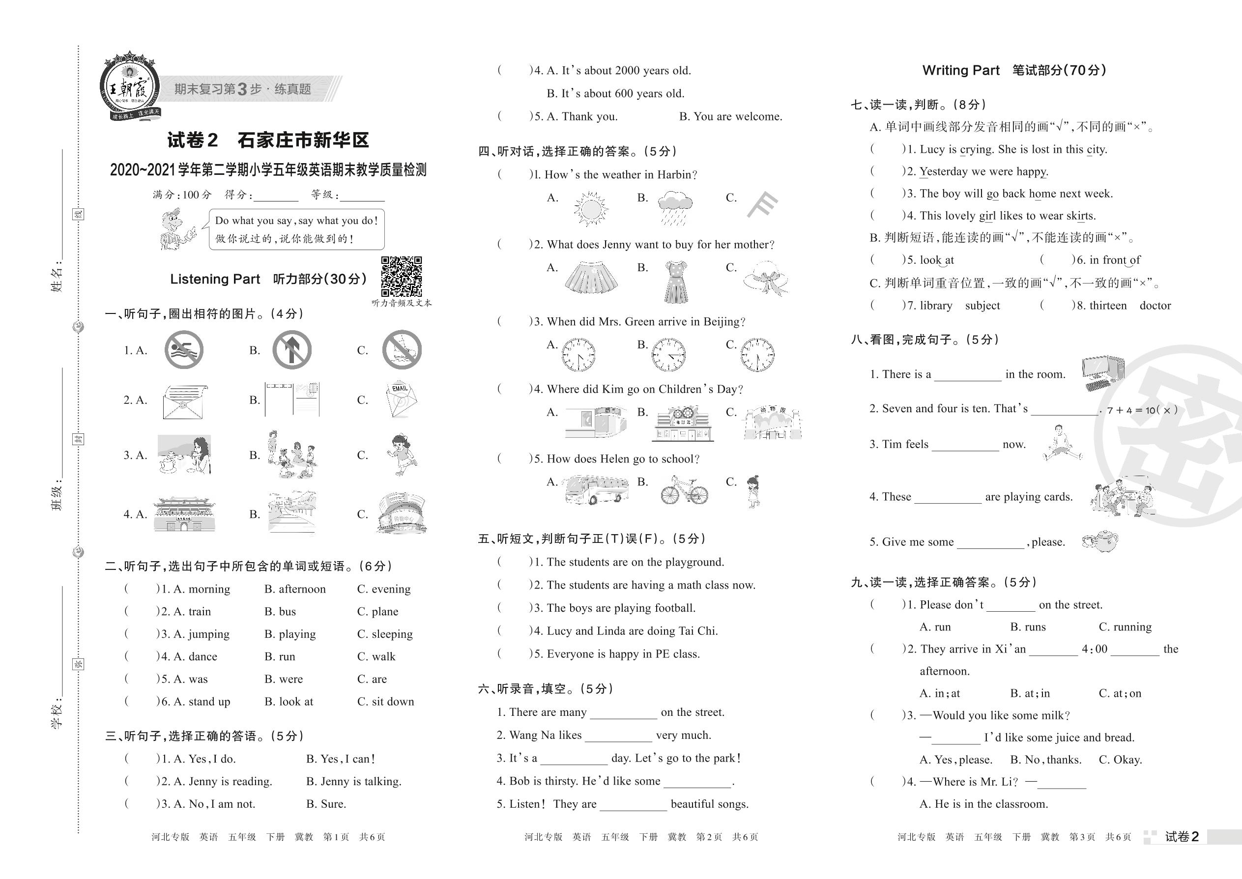 石家庄市新华区2020~2021学年第二学期小学五年级英语期末教学质量检测(冀教版)【2】