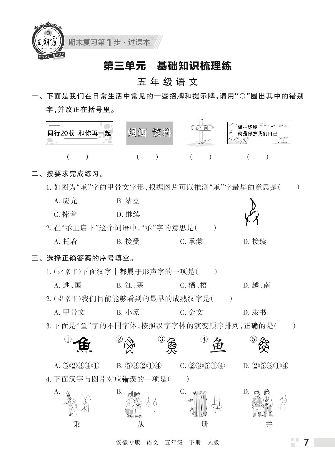 王朝霞期末过课本——第三单元 基础知识梳理练五年级下册语文(人教版)