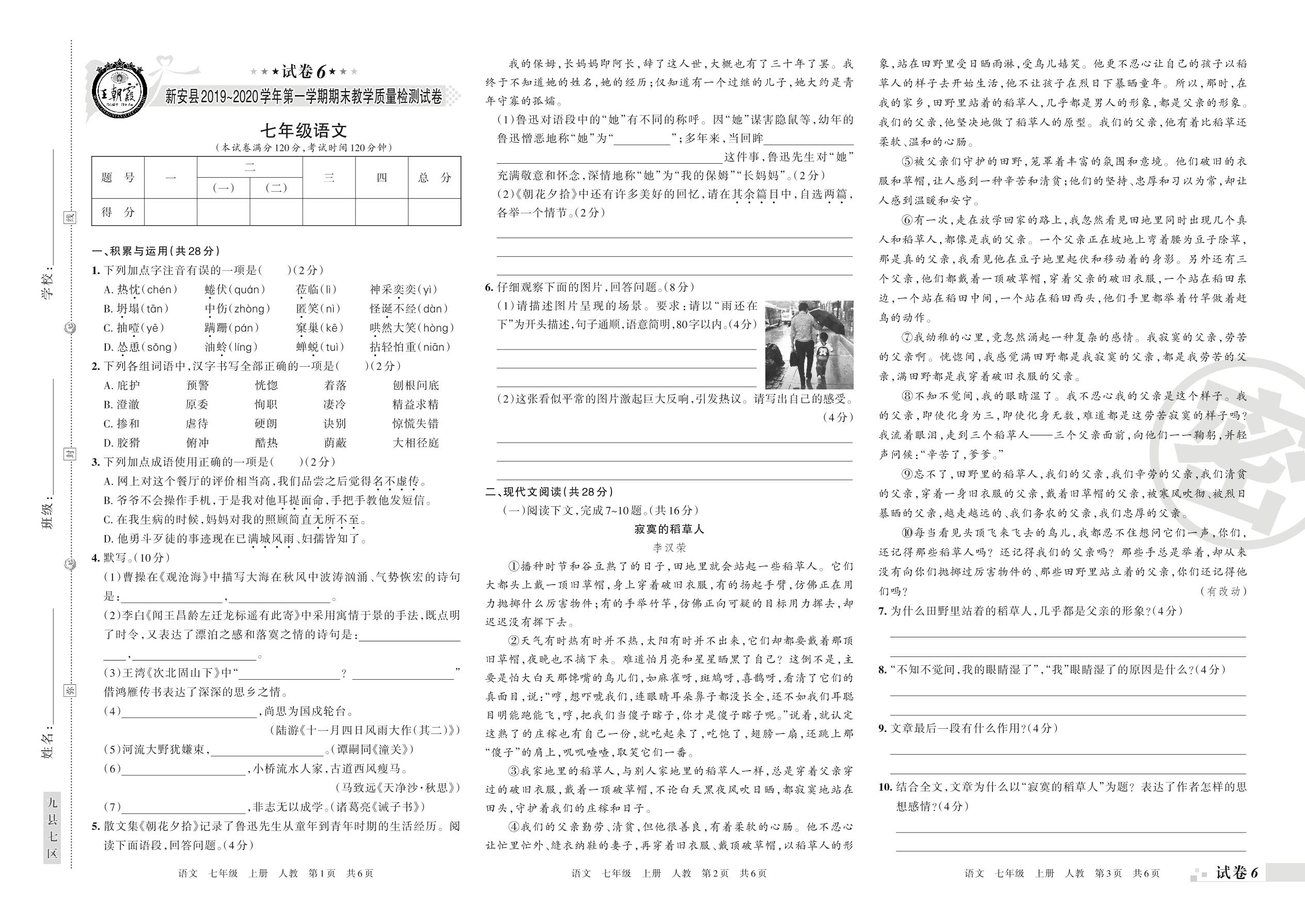 2019-2020学年第一学期洛阳市新安县七年级语文试卷(人教版)【6】