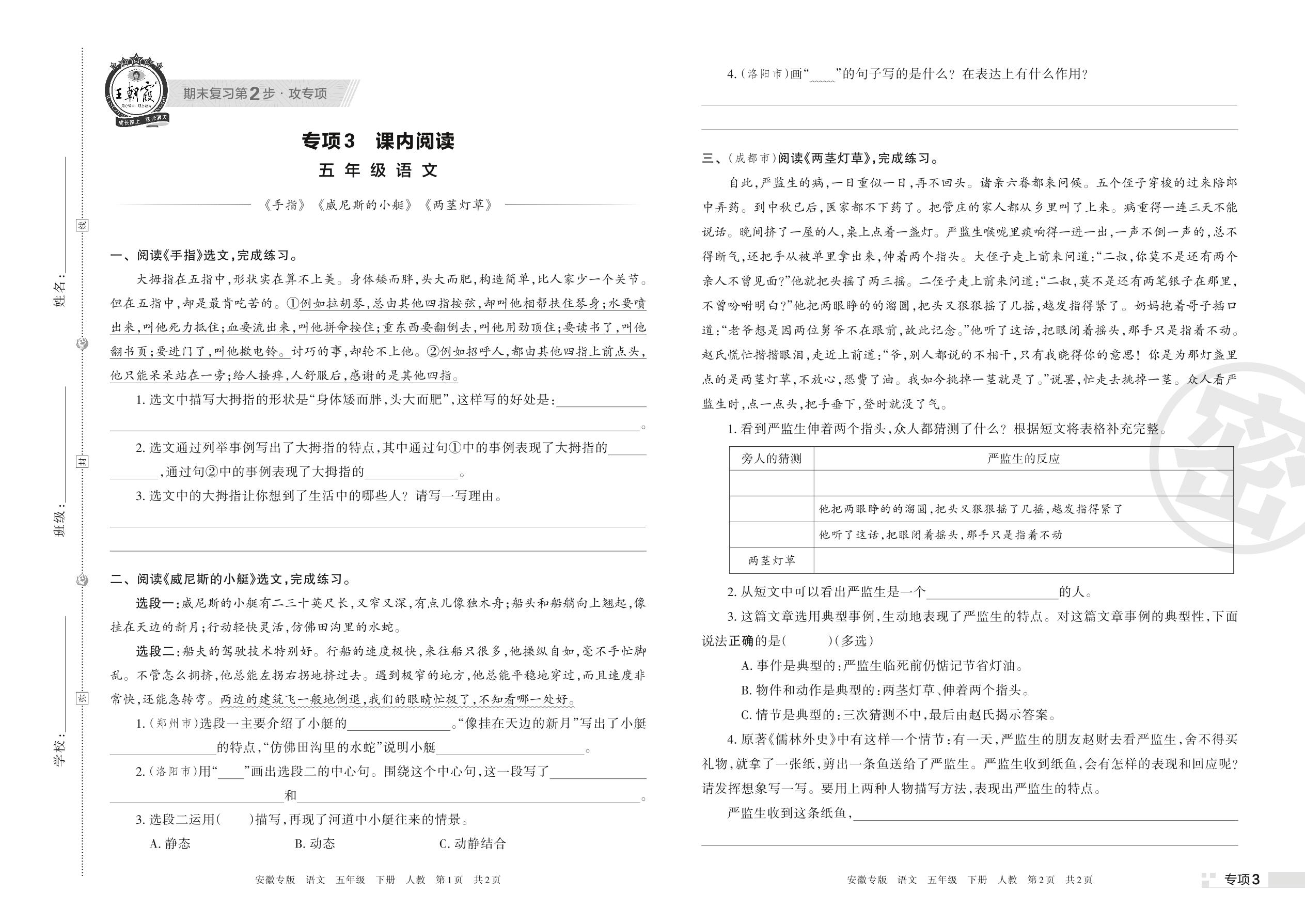 王朝霞期末专项卷——课内阅读五年级下册语文(人教版)【3】