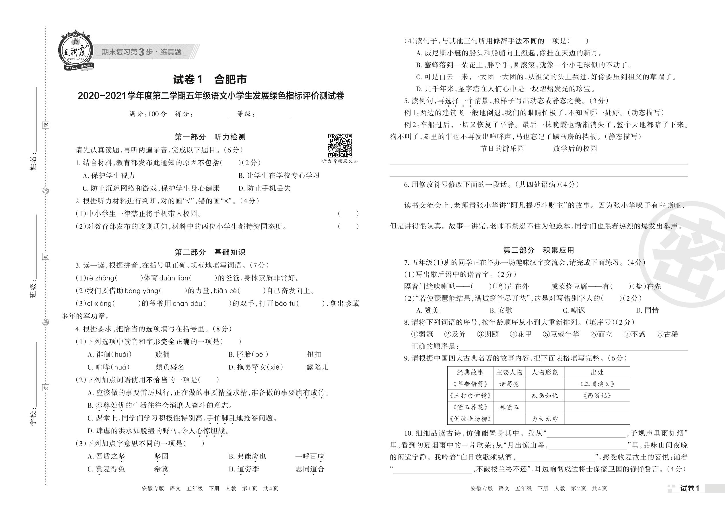 合肥市2020~2021学年度第二学期五年级语文小学生发展绿色指标评价测试卷(人教版)【1】