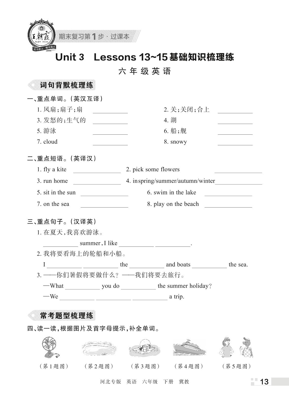 王朝霞期末过课本——Unit 3 Lessons 13~15基础知识梳理练六年级下册英语(冀教版)