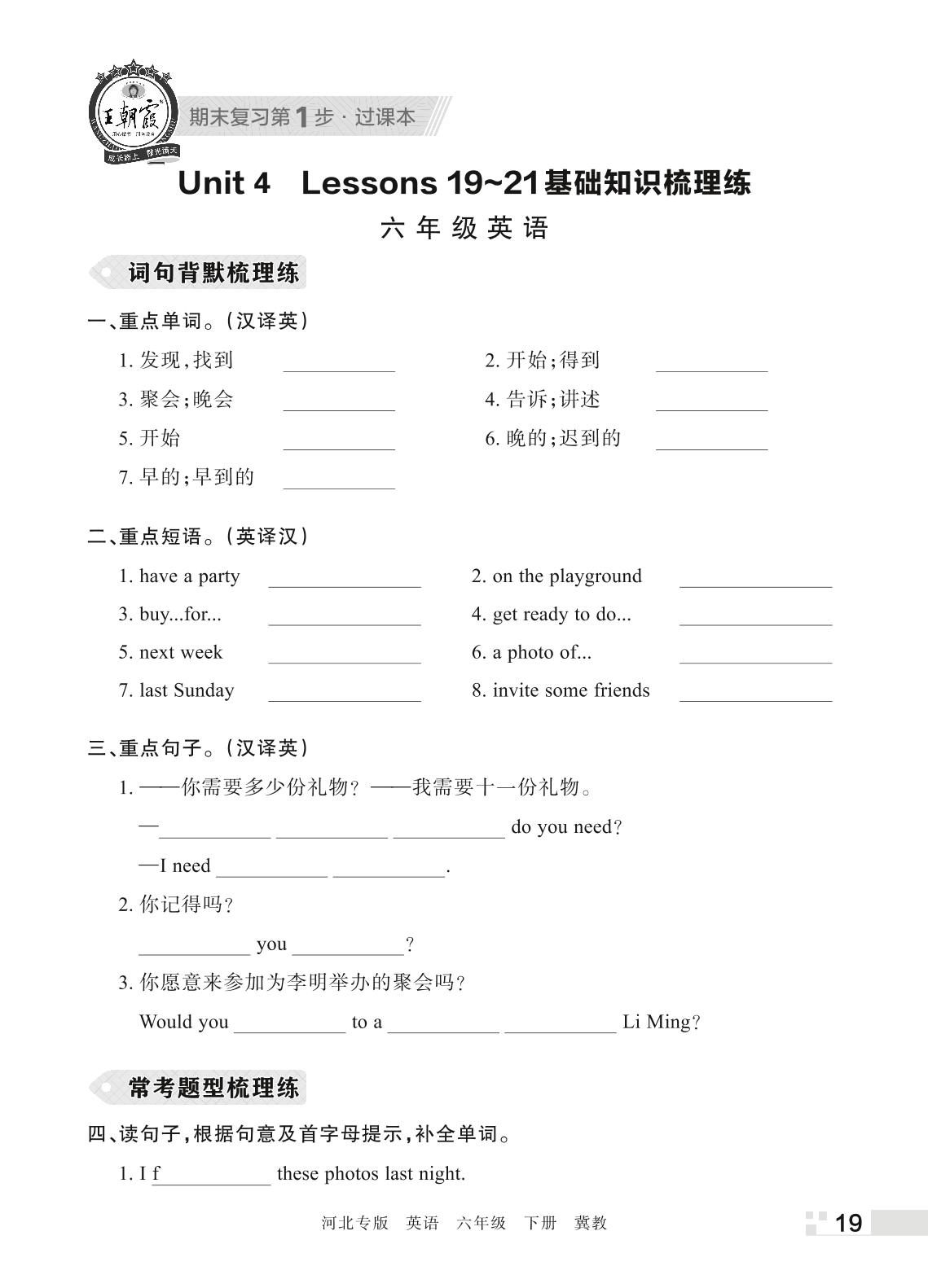 王朝霞期末过课本——Unit 4 Lessons 19~21基础知识梳理练六年级下册英语(冀教版)