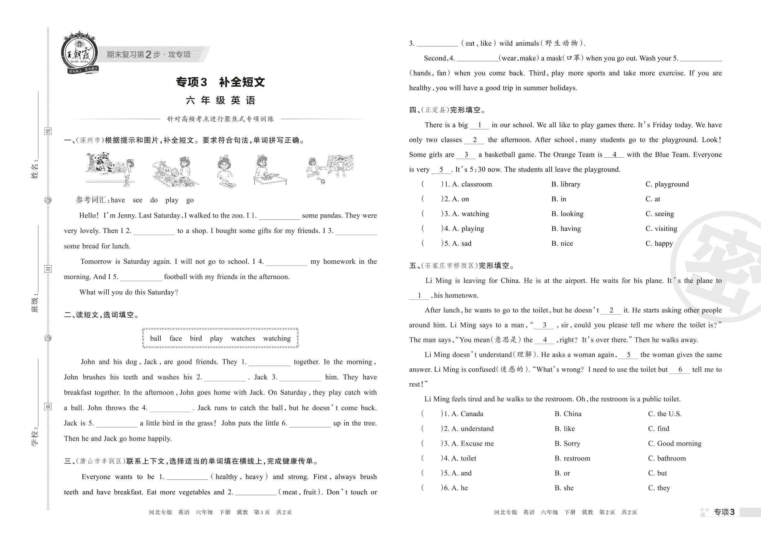 王朝霞期末专项卷——补全短文六年级下册英语(冀教版)【3】