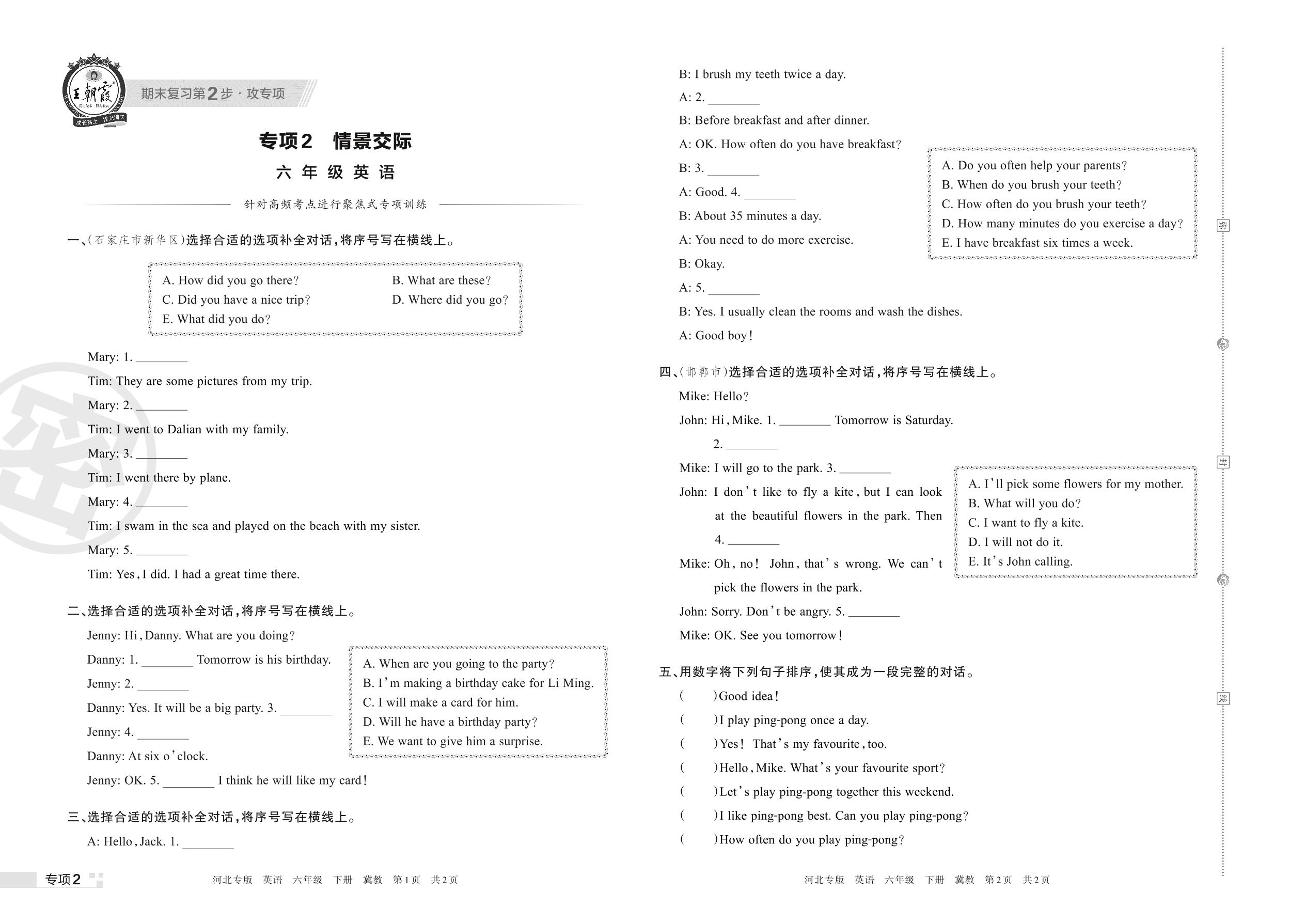 王朝霞期末专项卷——情景交际六年级下册英语(冀教版)【2】