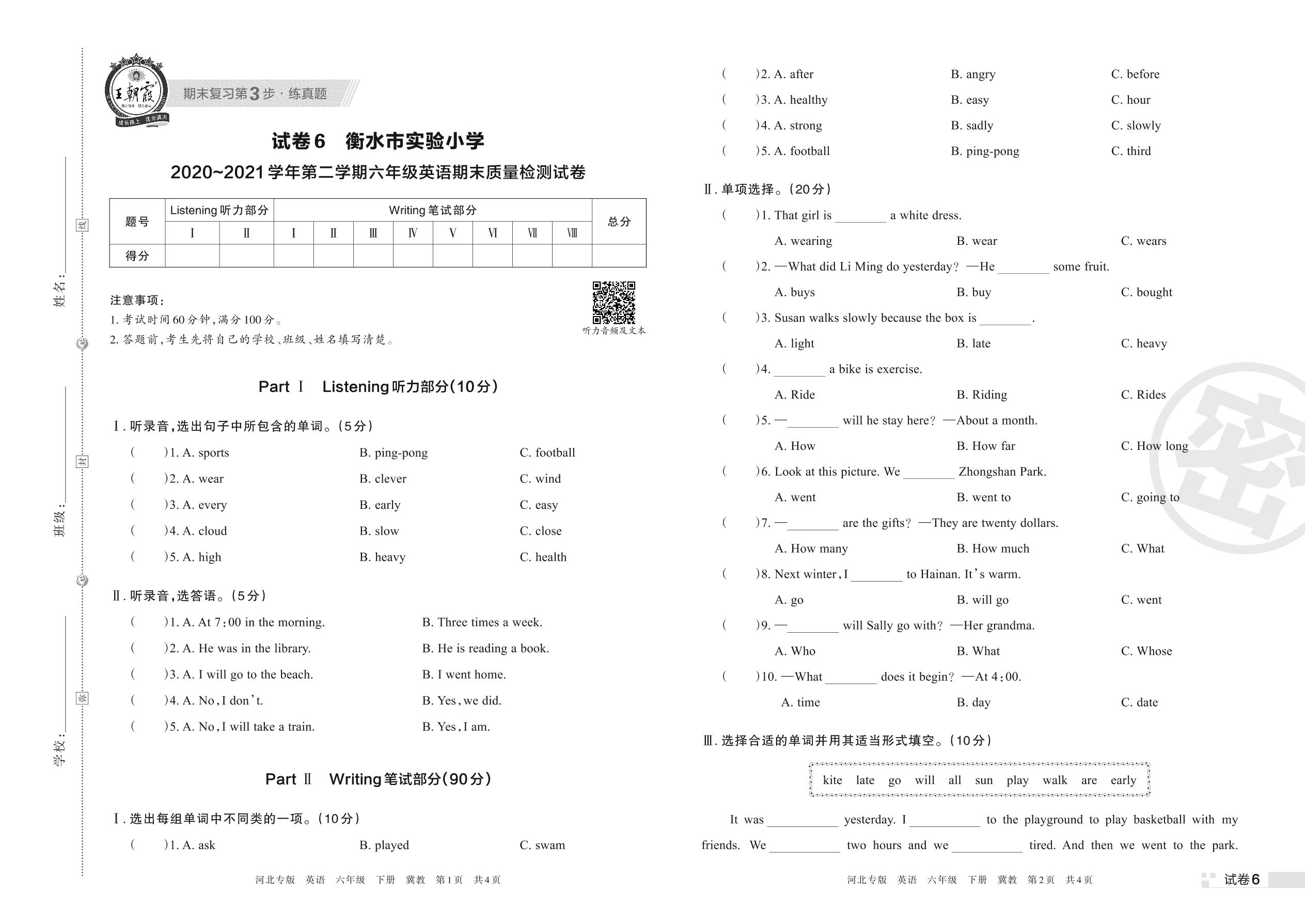 衡水市实验小学2020~2021学年第二学期六年级英语期末质量检测试卷(冀教版)【6】