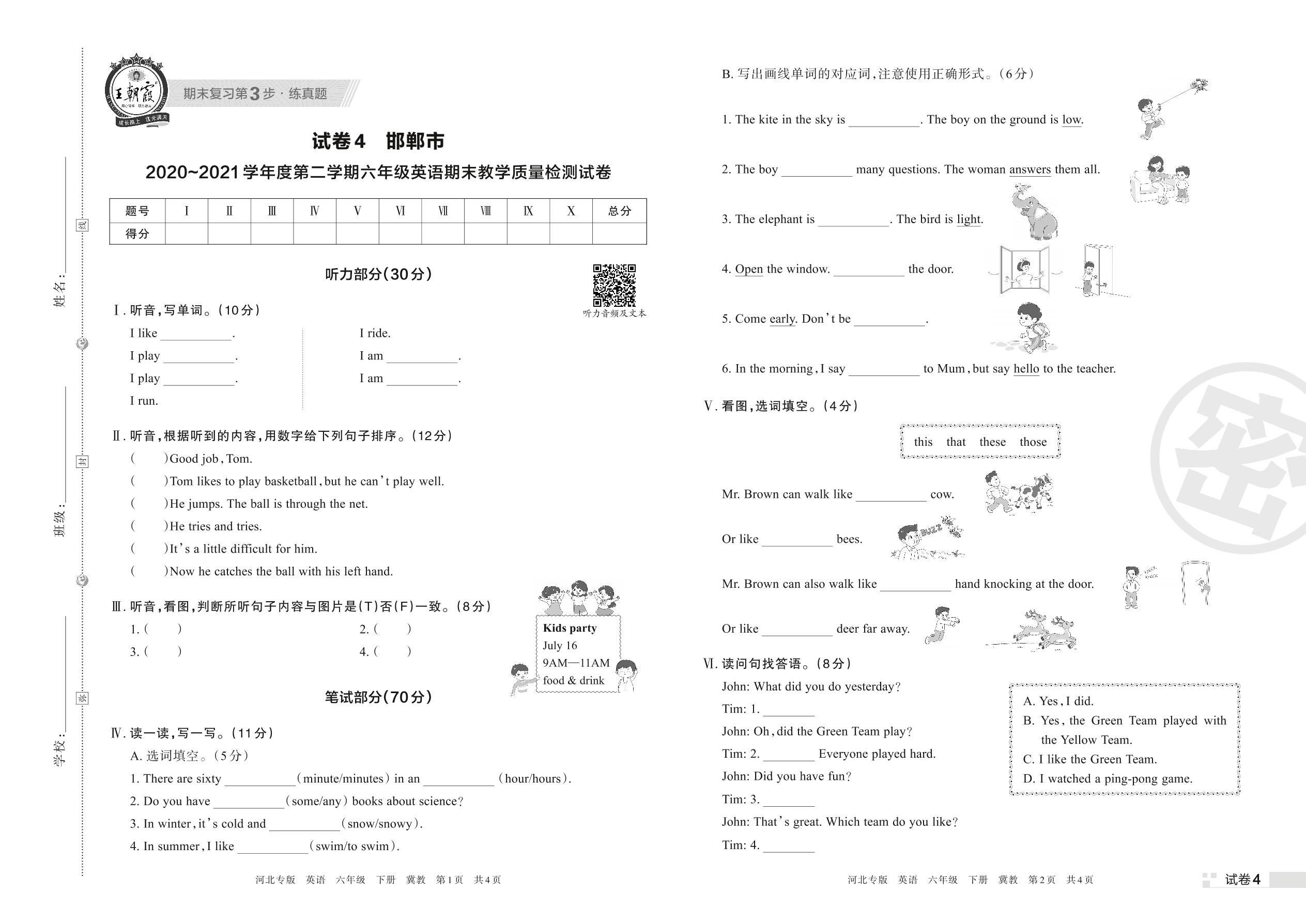 邯郸市2020~2021学年度第二学期六年级英语期末教学质量检测试卷(冀教版)【4】