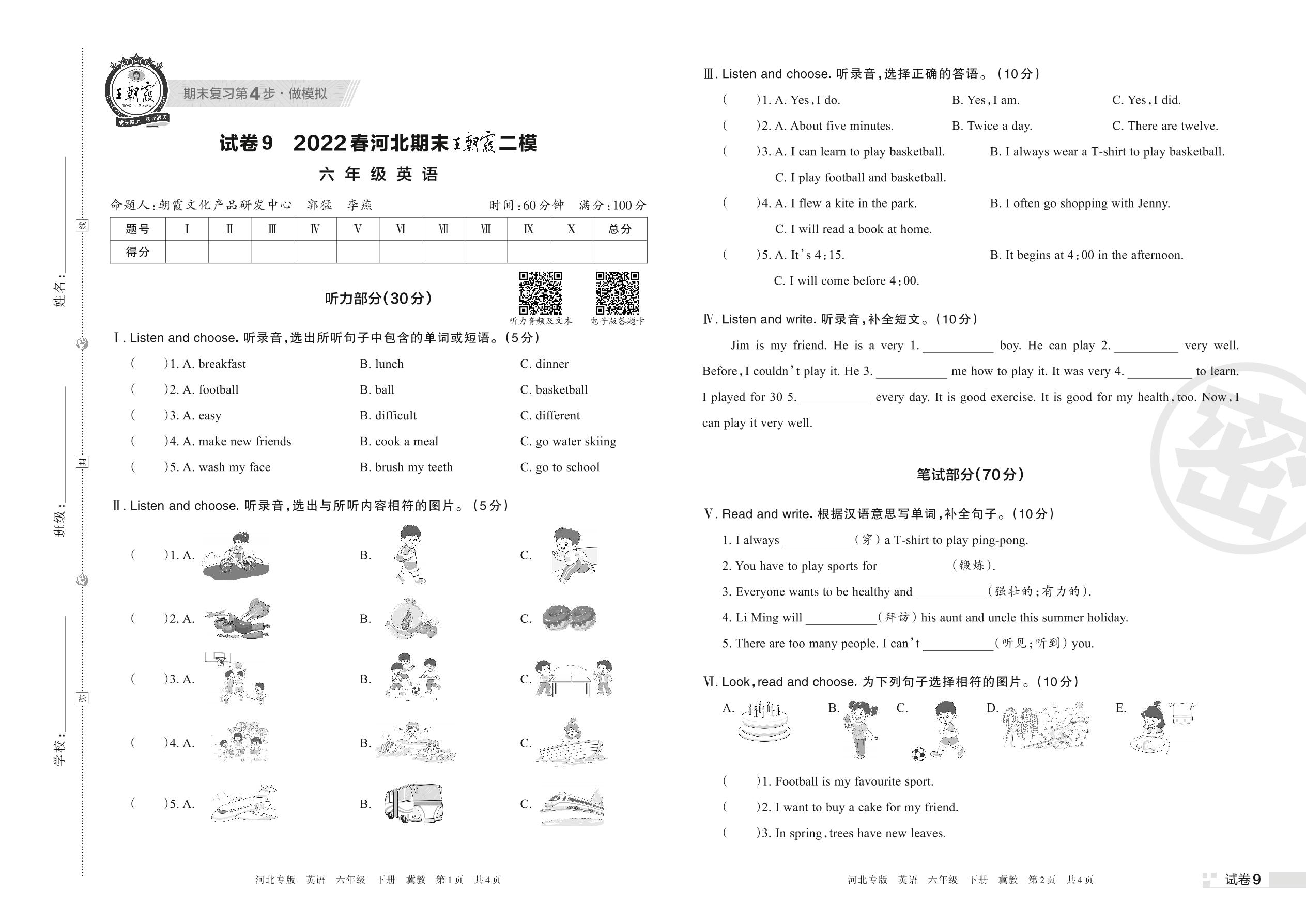 王朝霞期末模拟卷六年级下册英语(冀教版)【9】