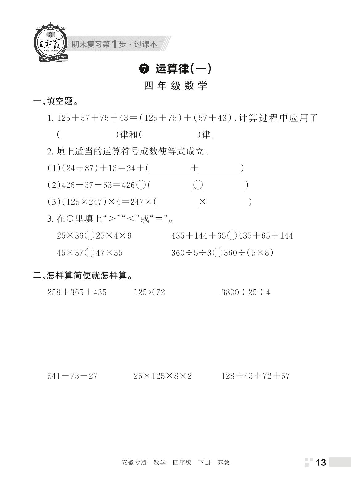 王朝霞期末过课本——7 运算律(一)四年级下册数学(苏教版)