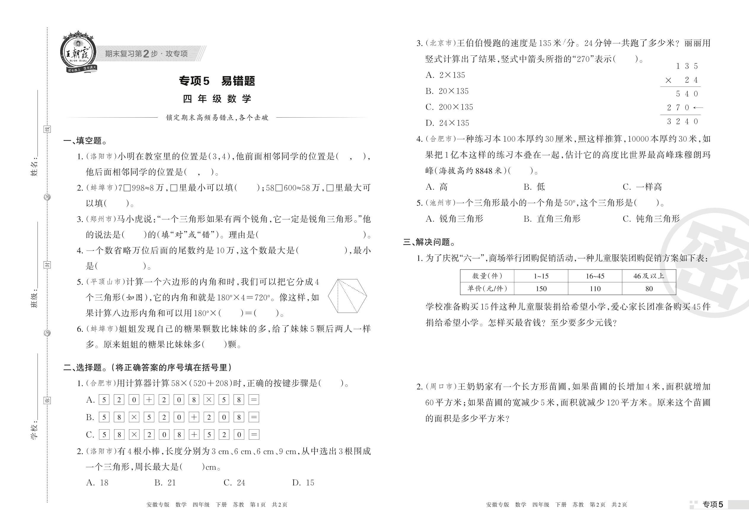 王朝霞期末专项卷——易错题四年级下册数学(苏教版)【5】