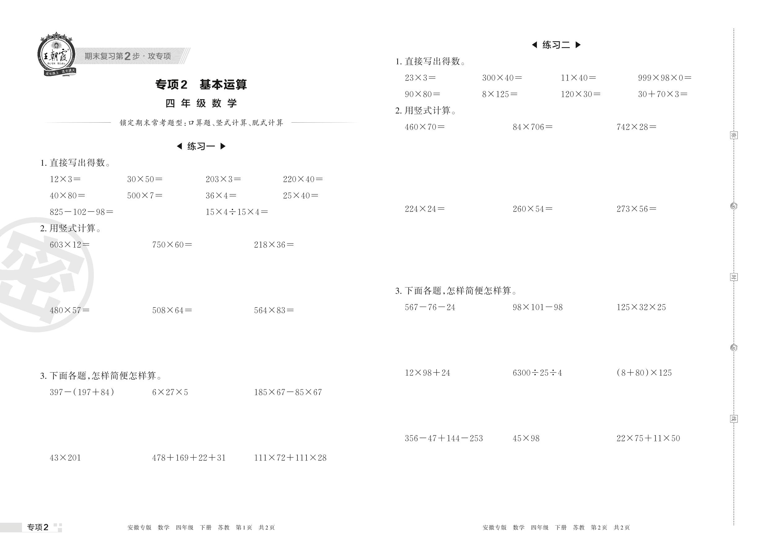王朝霞期末专项卷——基本运算四年级下册数学(苏教版)【2】