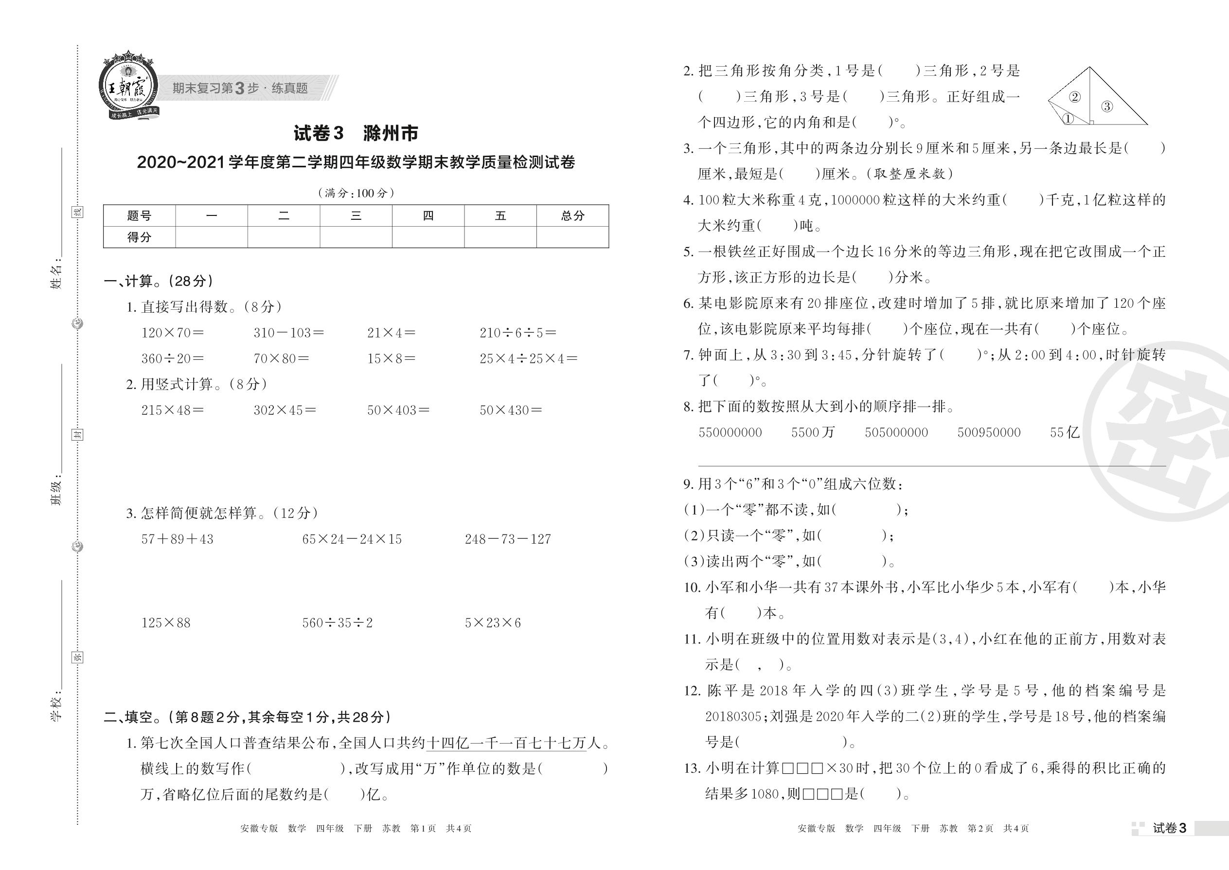滁州市2020~2021学年度第二学期四年级数学期末教学质量检测试卷(苏教版)【3】