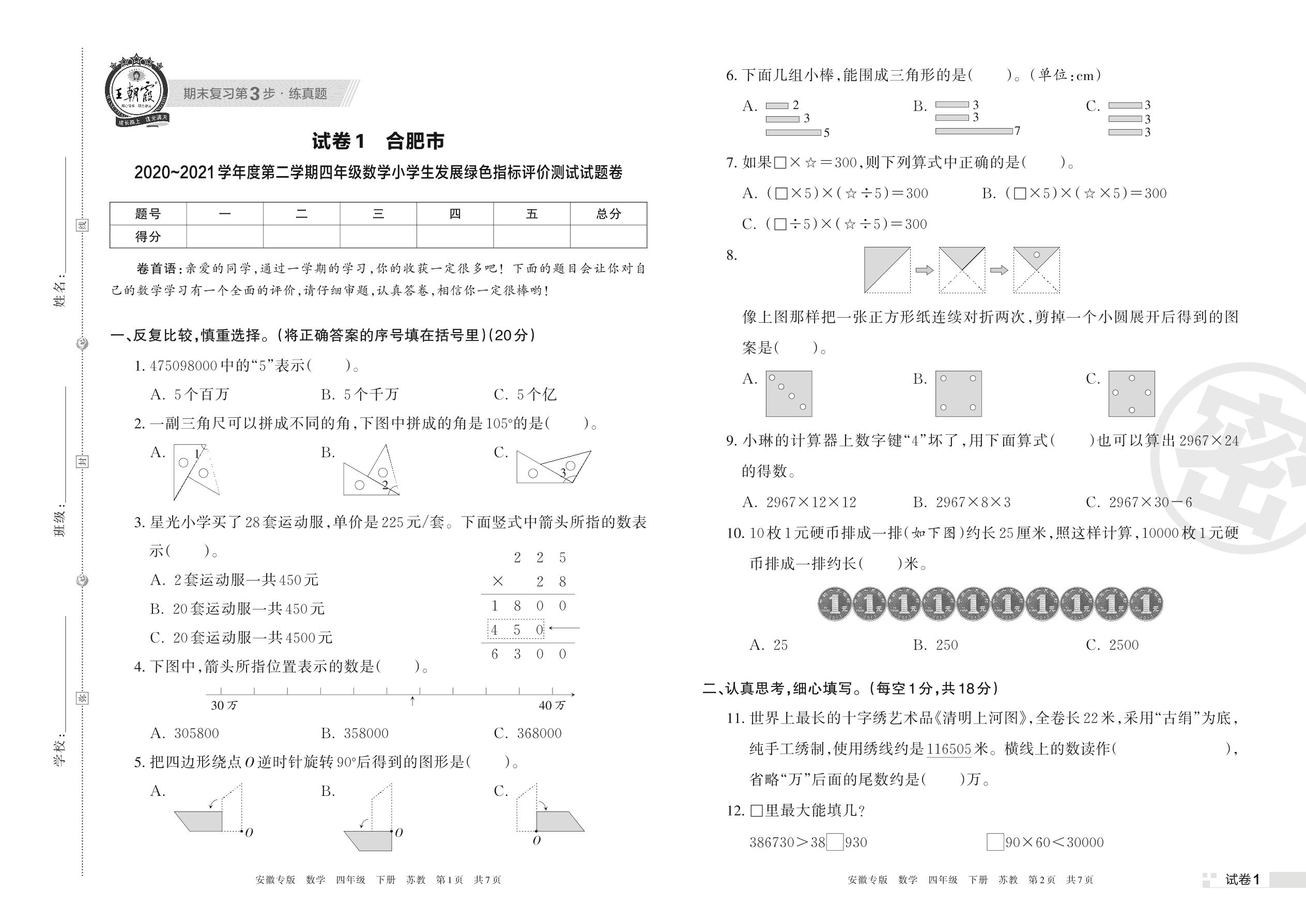 合肥市2020~2021学年度第二学期四年级数学小学生发展绿色指标评价测试试题卷(苏教版)【1】