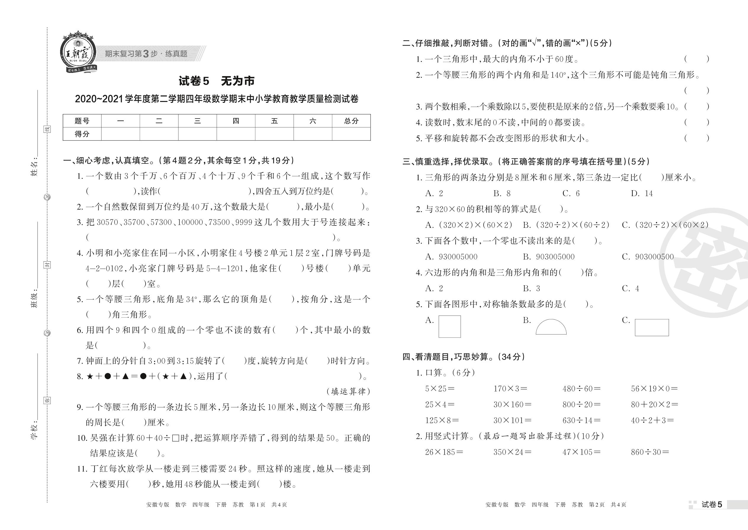 无为市2020~2021学年度第二学期四年级数学期末中小学教育教学质量检测试卷(苏教版)【5】