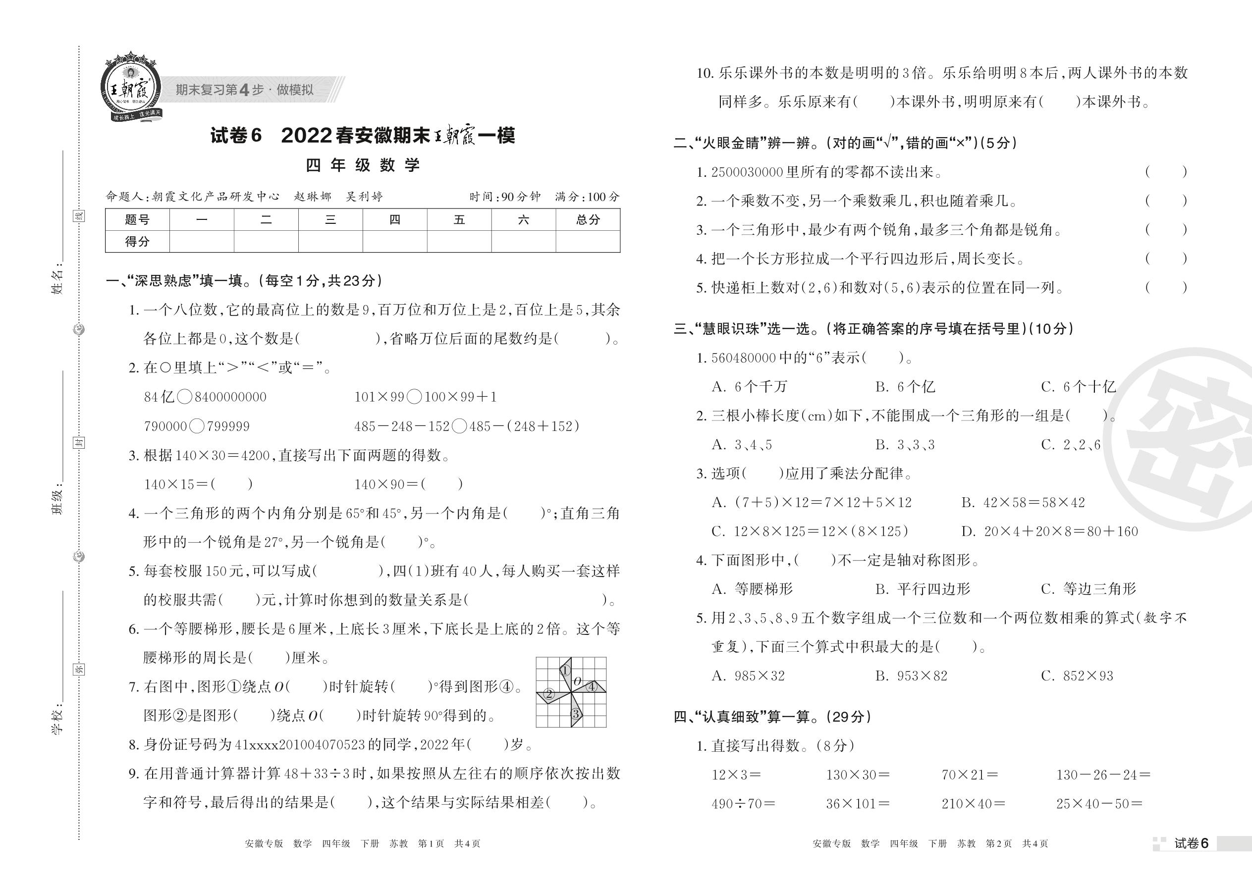王朝霞期末模拟卷四年级下册数学(苏教版)【6】