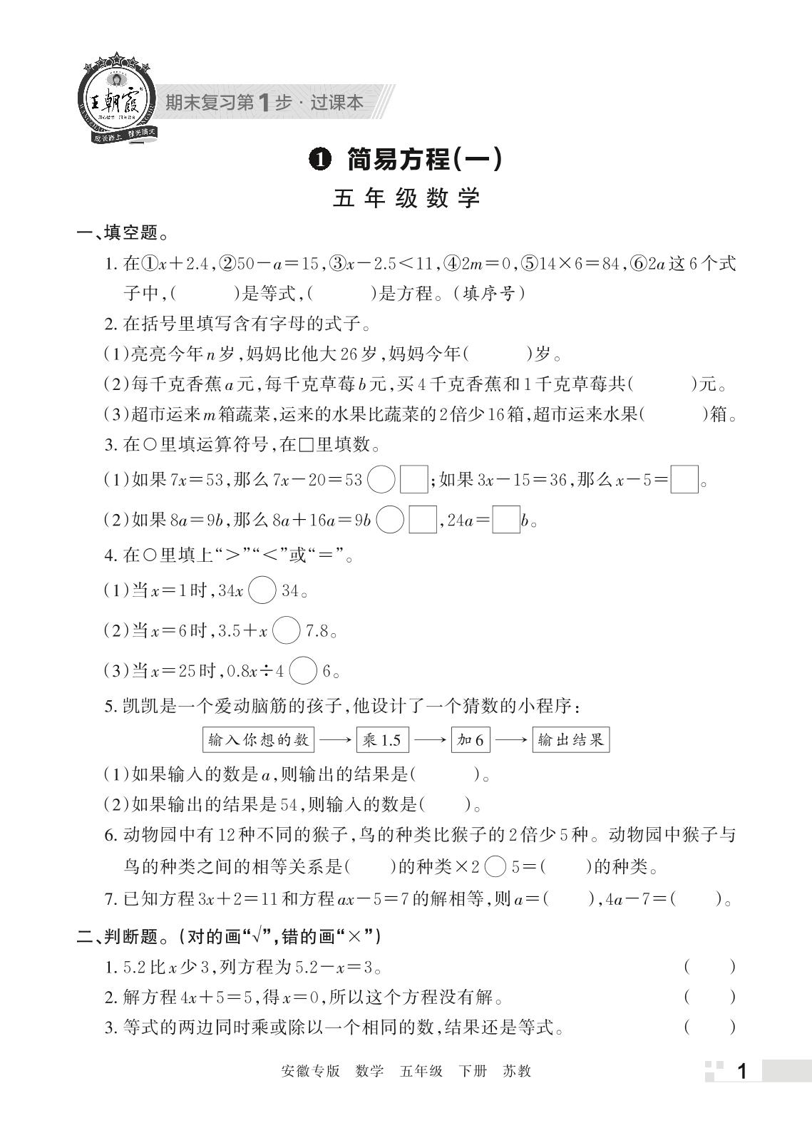 王朝霞期末过课本——1 简易方程(一)五年级下册数学(苏教版)