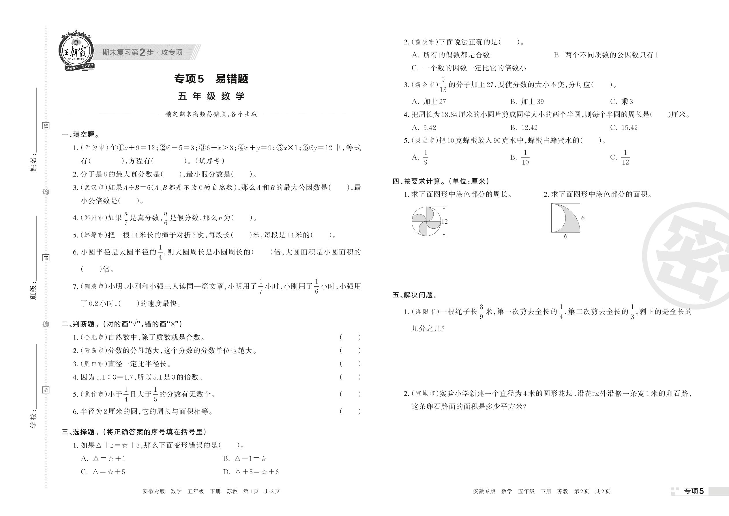 王朝霞期末专项卷——易错题五年级下册数学(苏教版)【5】