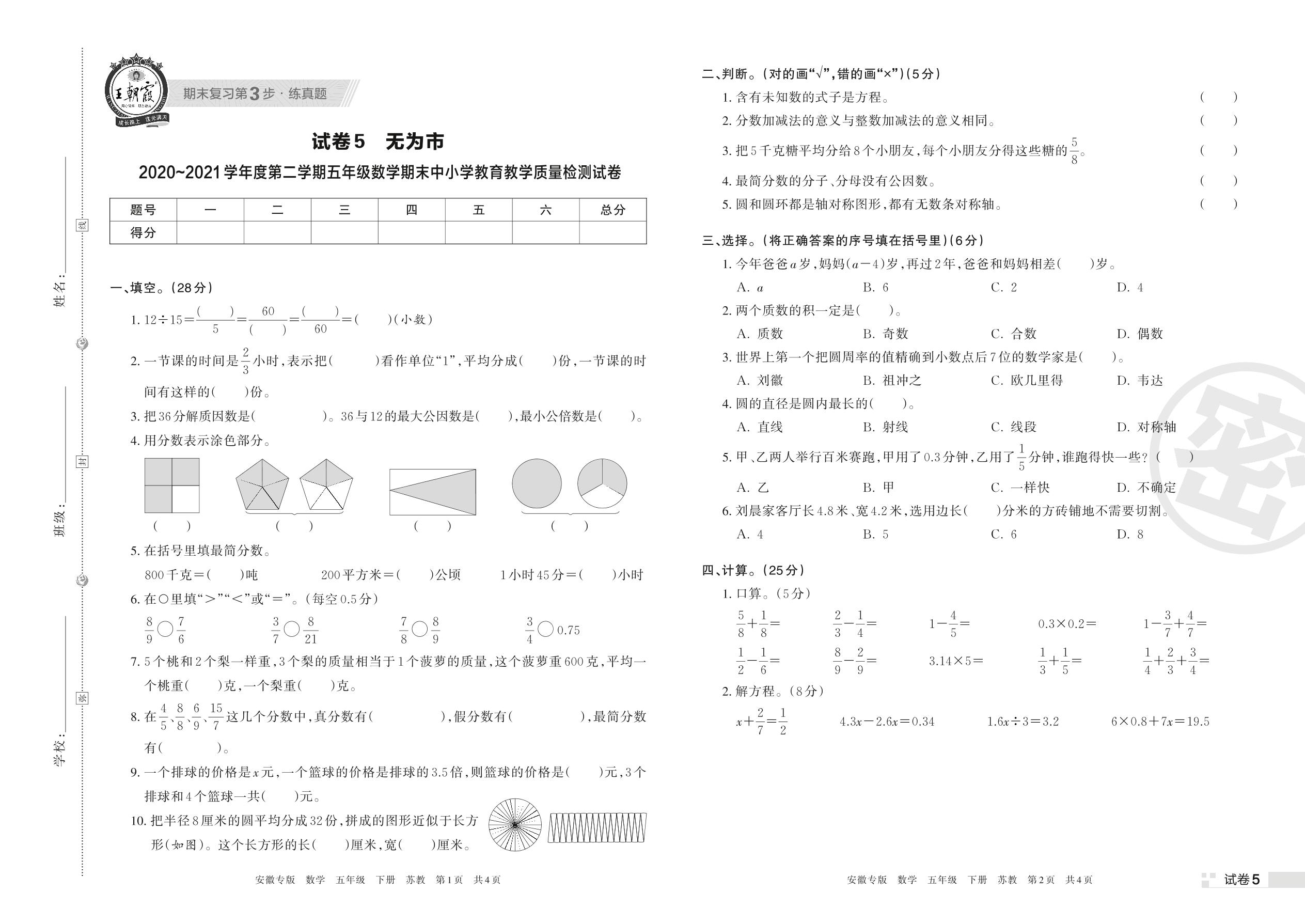无为市2020~2021学年度第二学期五年级数学期末中小学教育教学质量检测试卷(苏教版)【5】