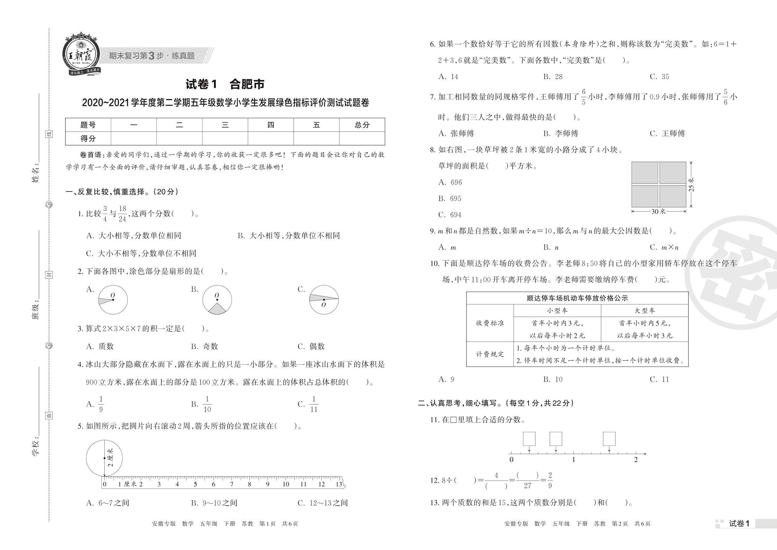 合肥市2020~2021学年度第二学期五年级数学小学生发展绿色指标评价测试试题卷(苏教版)【1】