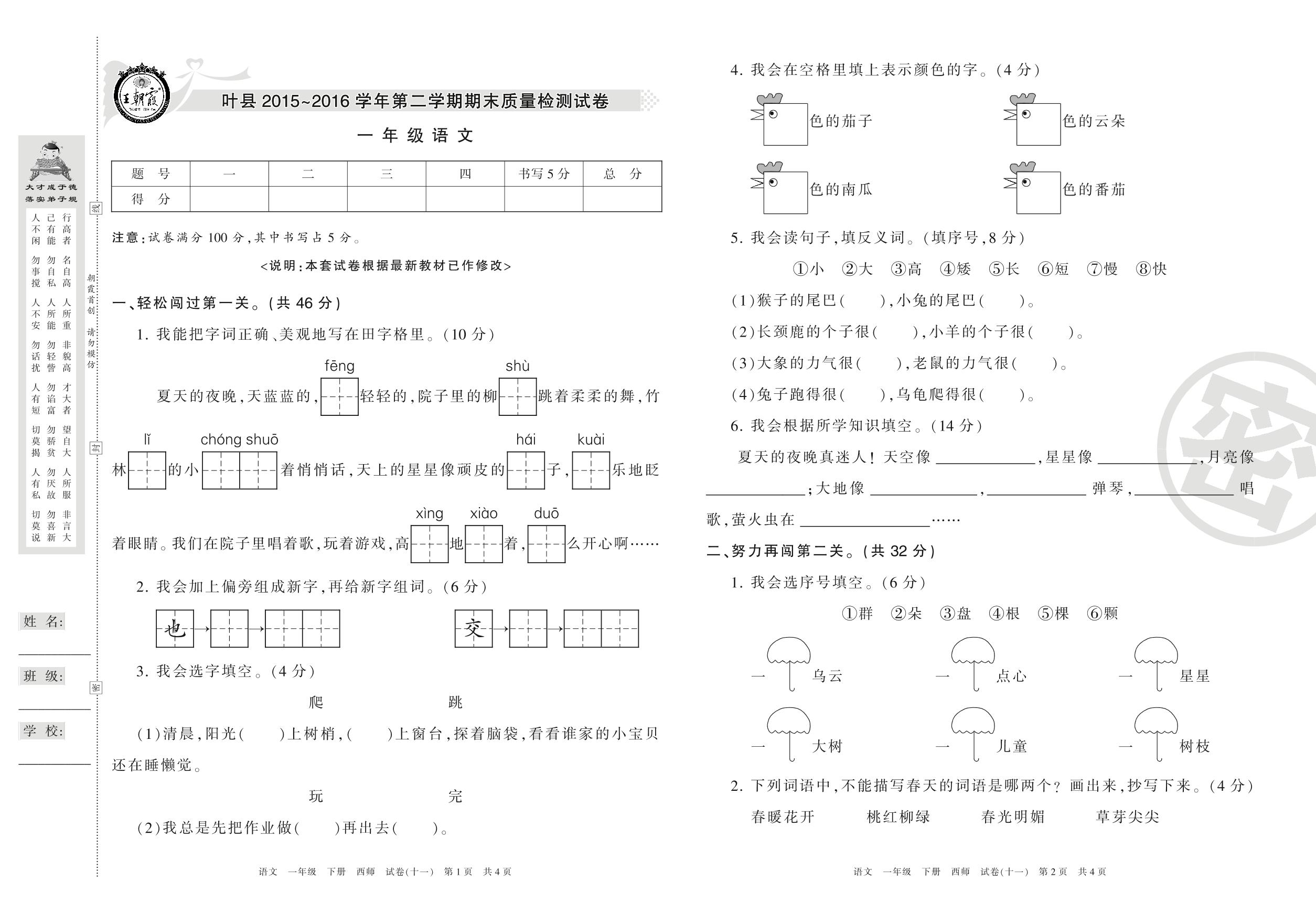 2015-2016学年第二学期平顶山市叶县一年级语文试卷(西师版)【11】