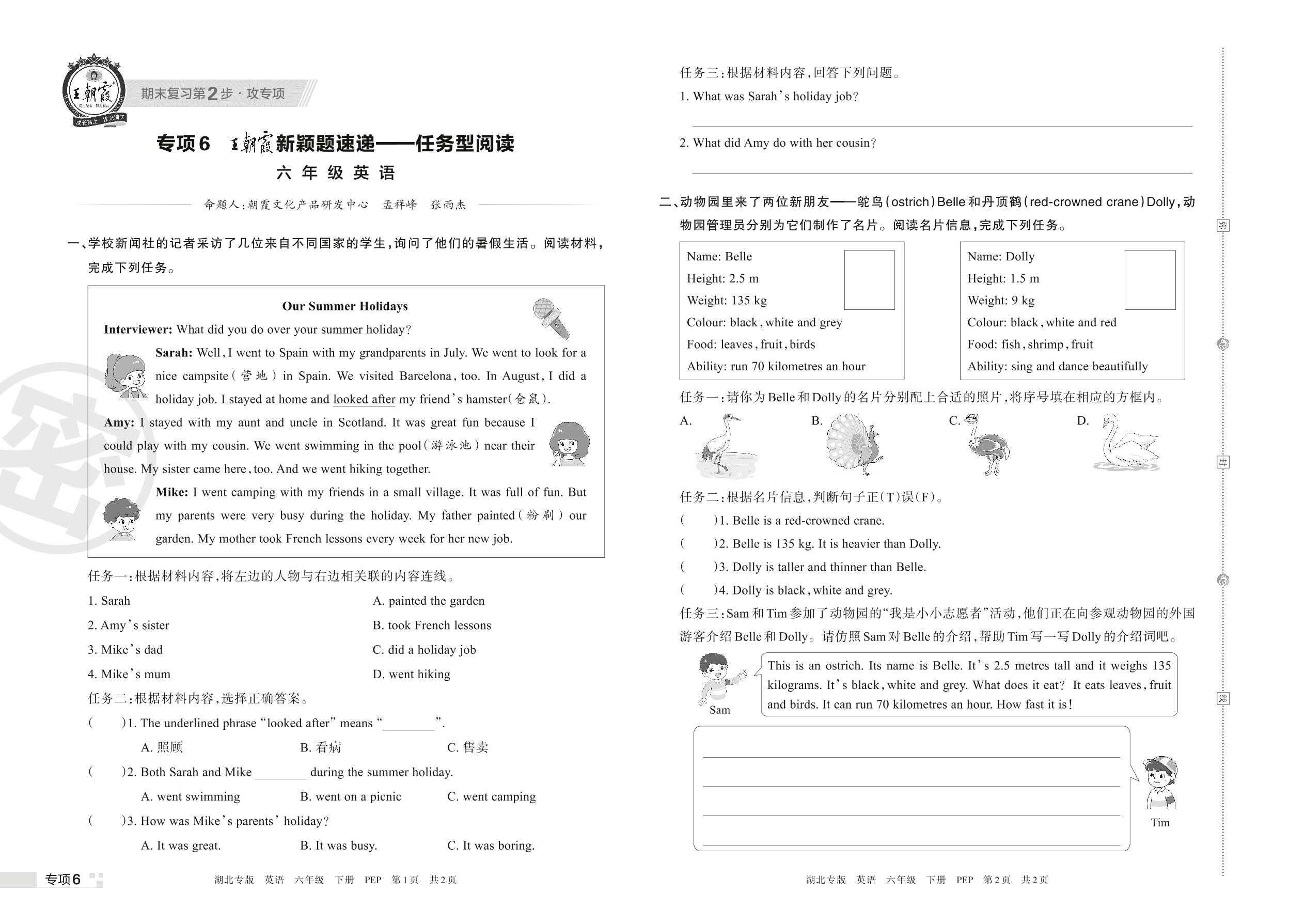 王朝霞期末专项卷——新颖题速递:任务型阅读六年级下册英语(PEP版)_R220328170733594【6】