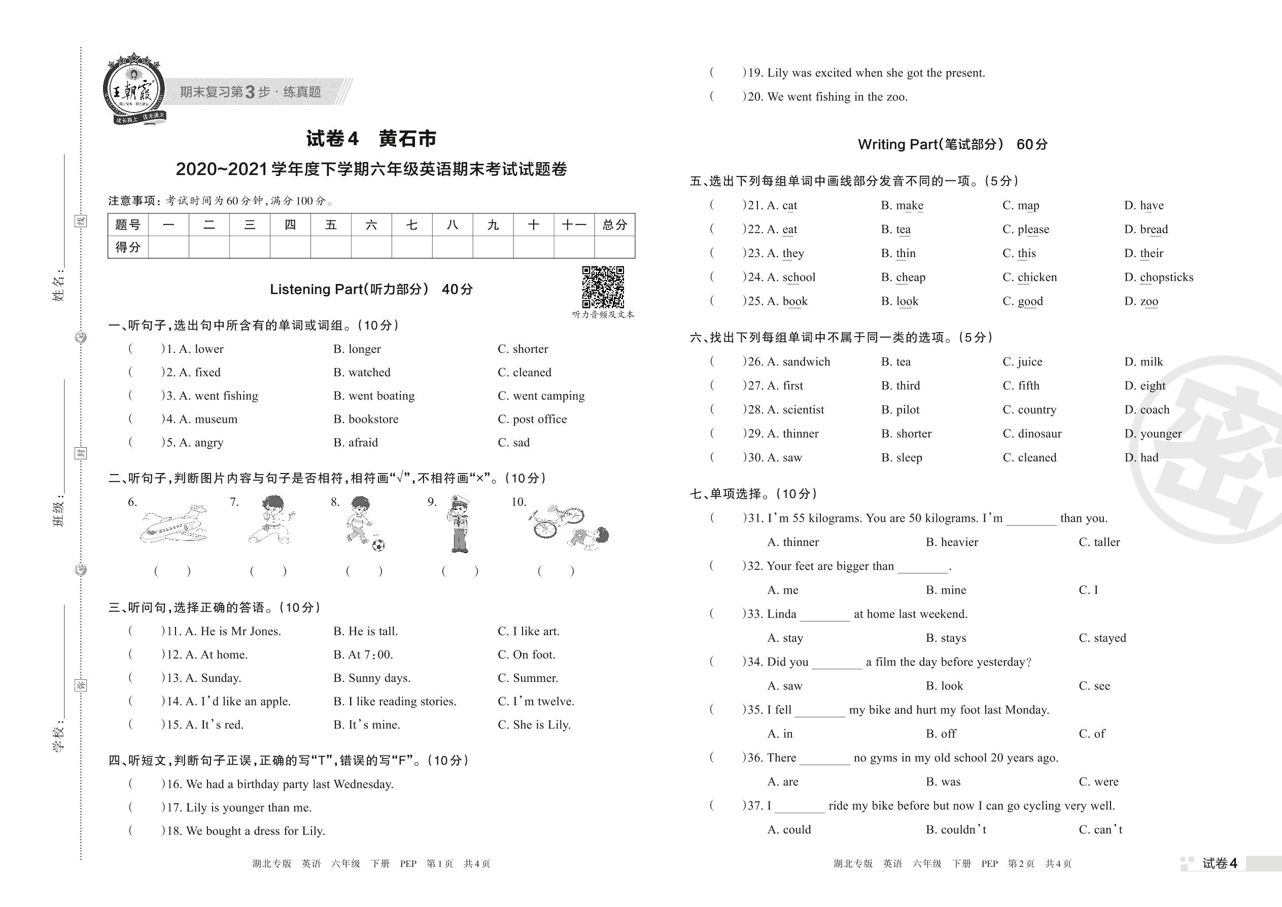 黄石市2020~2021学年度下学期六年级英语期末考试试题卷(PEP版)【4】