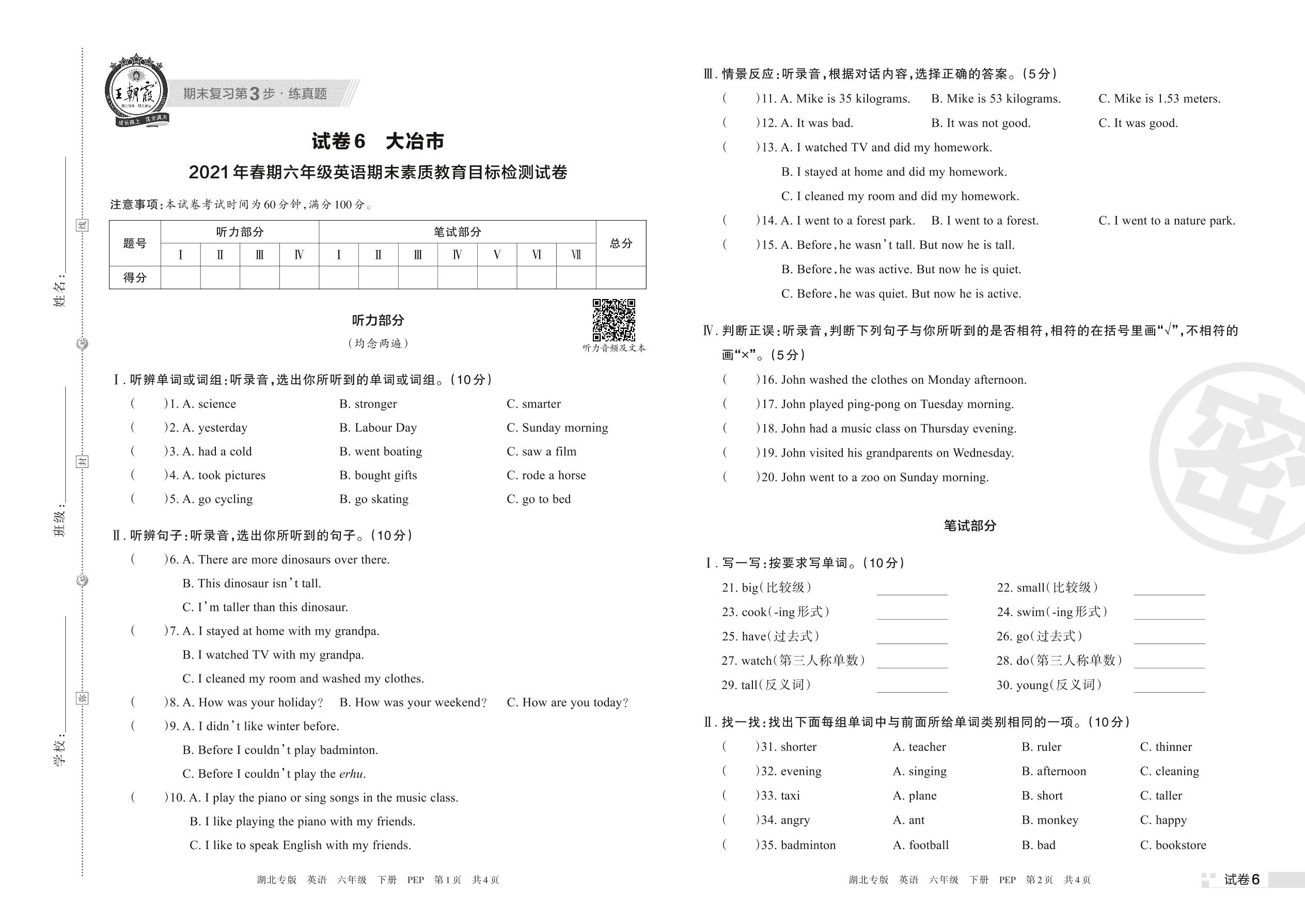 大冶市2021年春期六年级英语期末素质教育目标检测试卷(PEP版)【6】