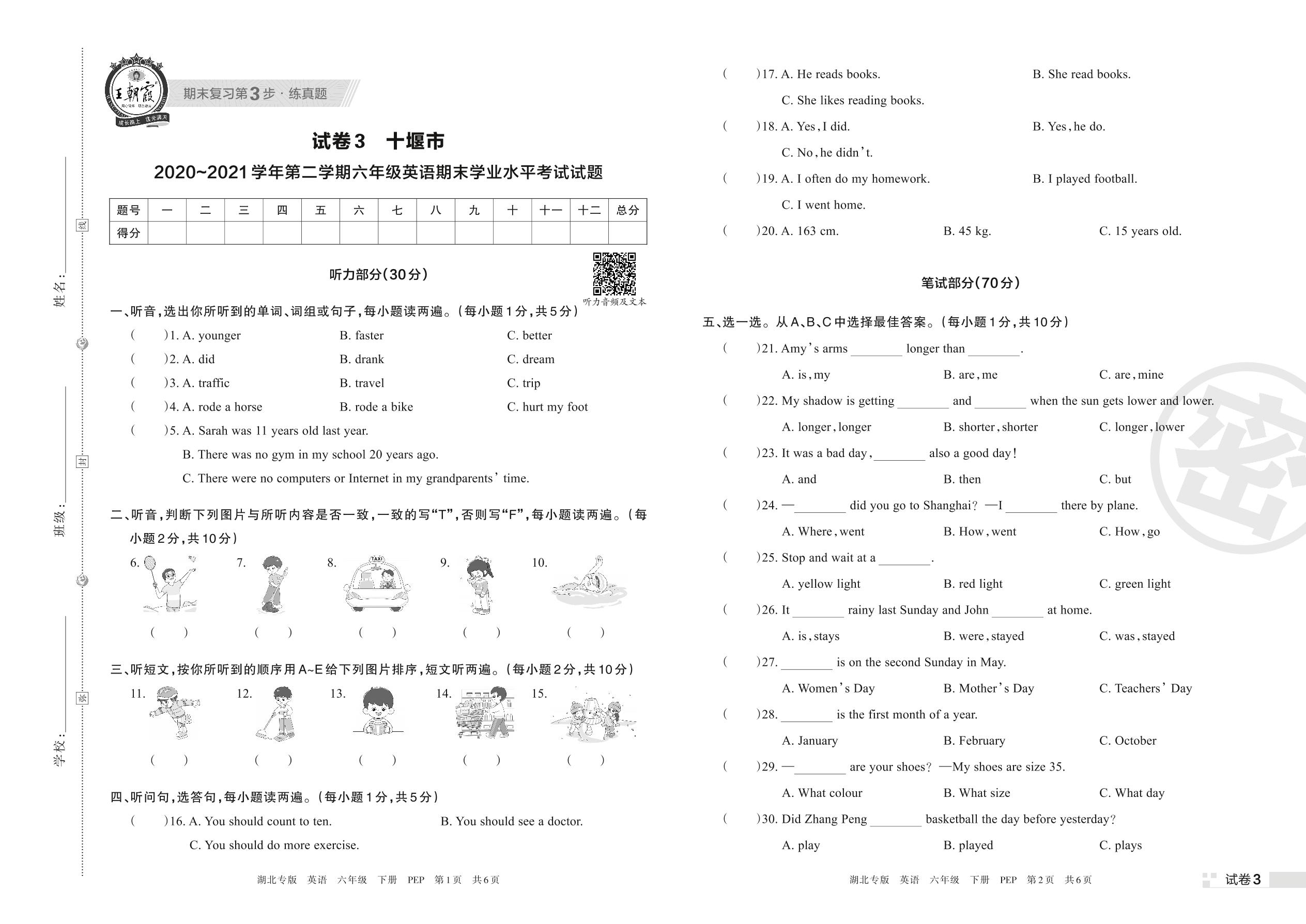 十堰市2020~2021学年第二学期六年级英语期末学业水平考试试题 (PEP版)【3】