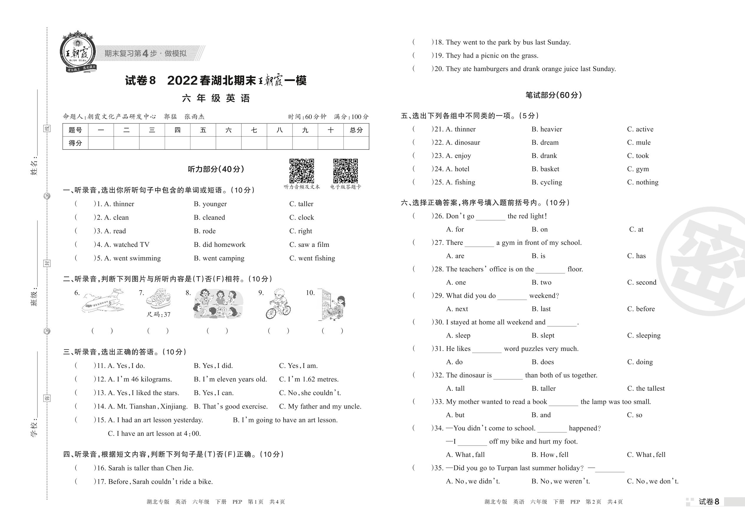 王朝霞期末模拟卷六年级下册英语(PEP版)_R220328170734407【8】