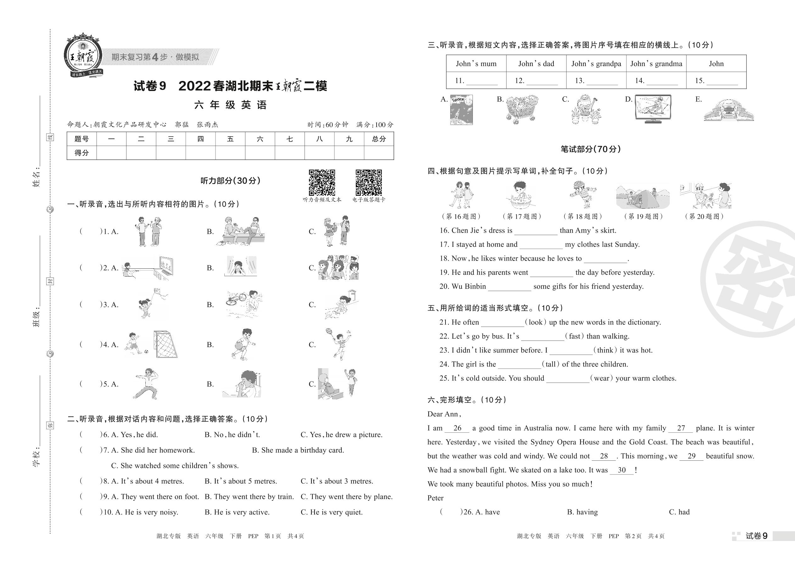 王朝霞期末模拟卷六年级下册英语(PEP版)【9】