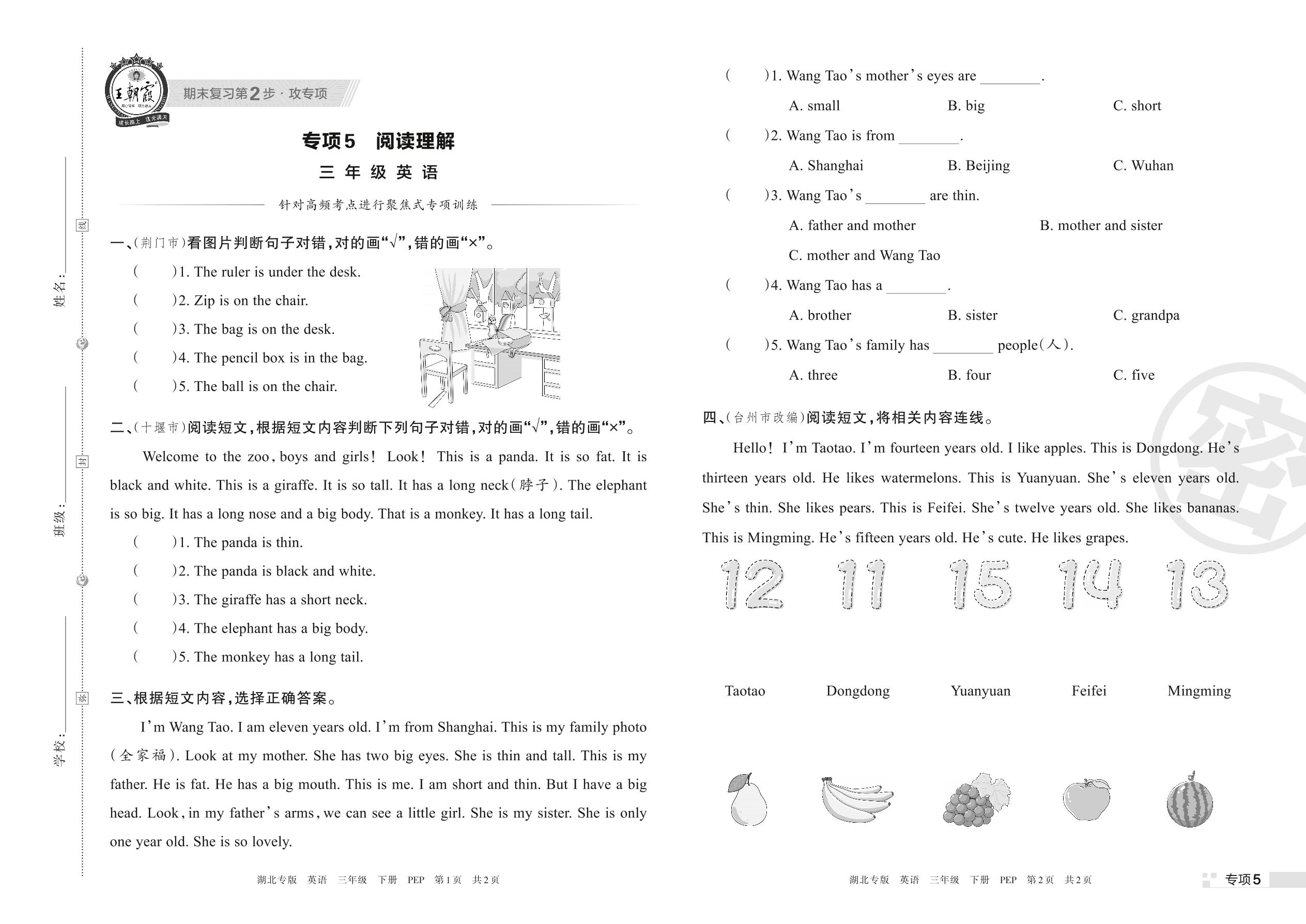 王朝霞期末专项卷——阅读理解三年级下册英语(PEP版)_R220328171546284【5】