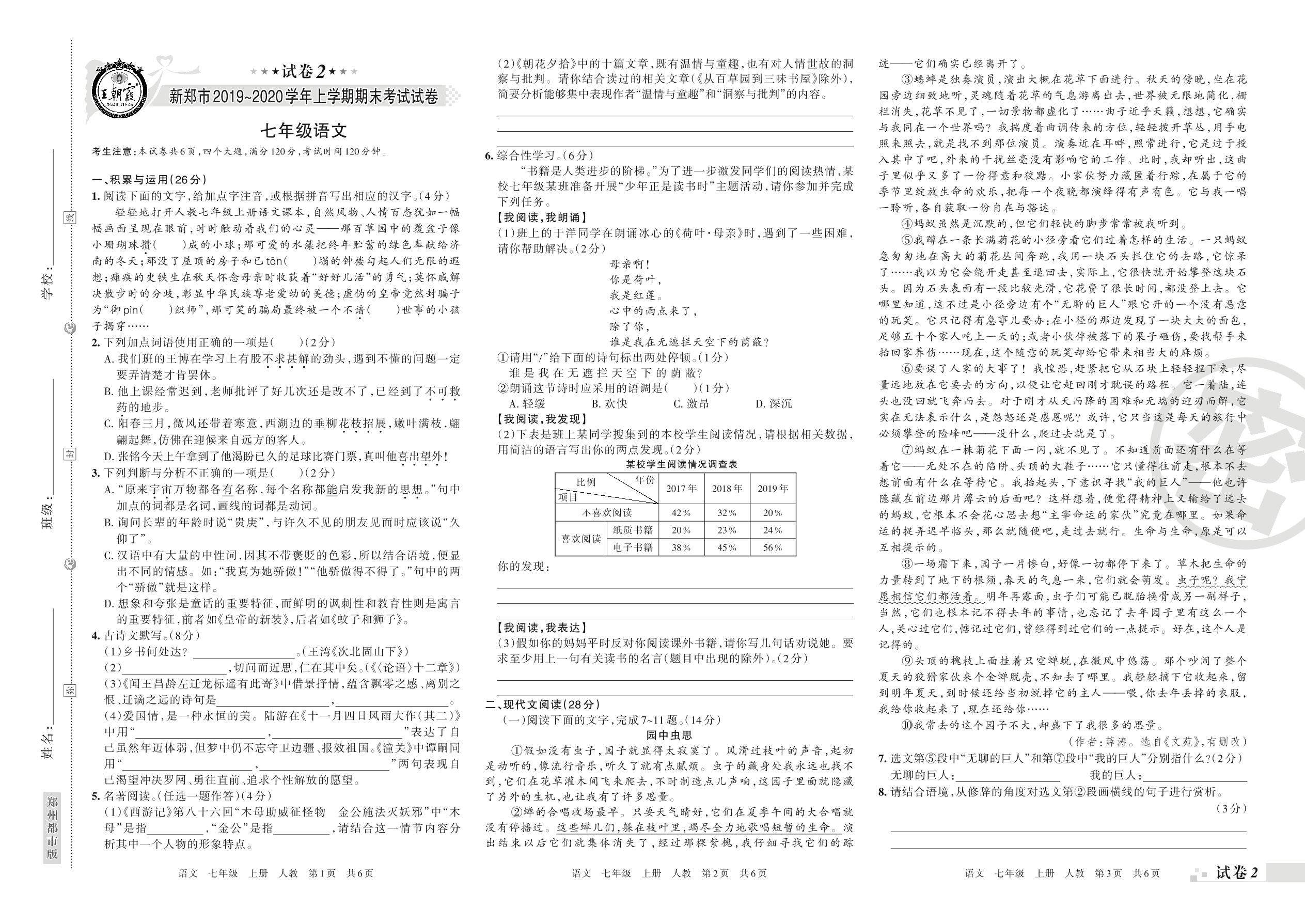 2019-2020学年第一学期新郑市七年级语文试卷(人教版)【2】