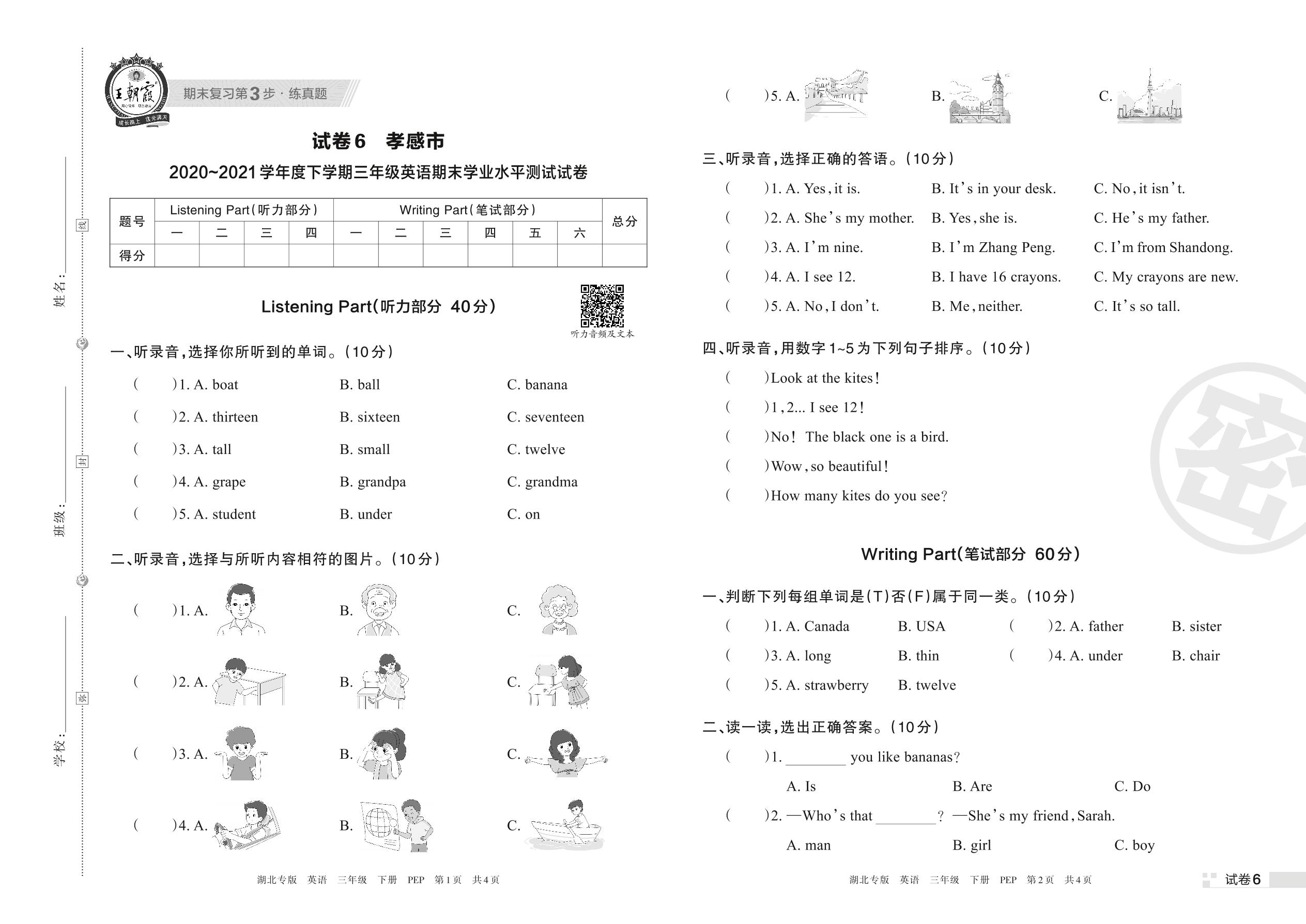 孝感市2020~2021学年度下学期三年级英语期末学业水平测试试卷(PEP版)【6】