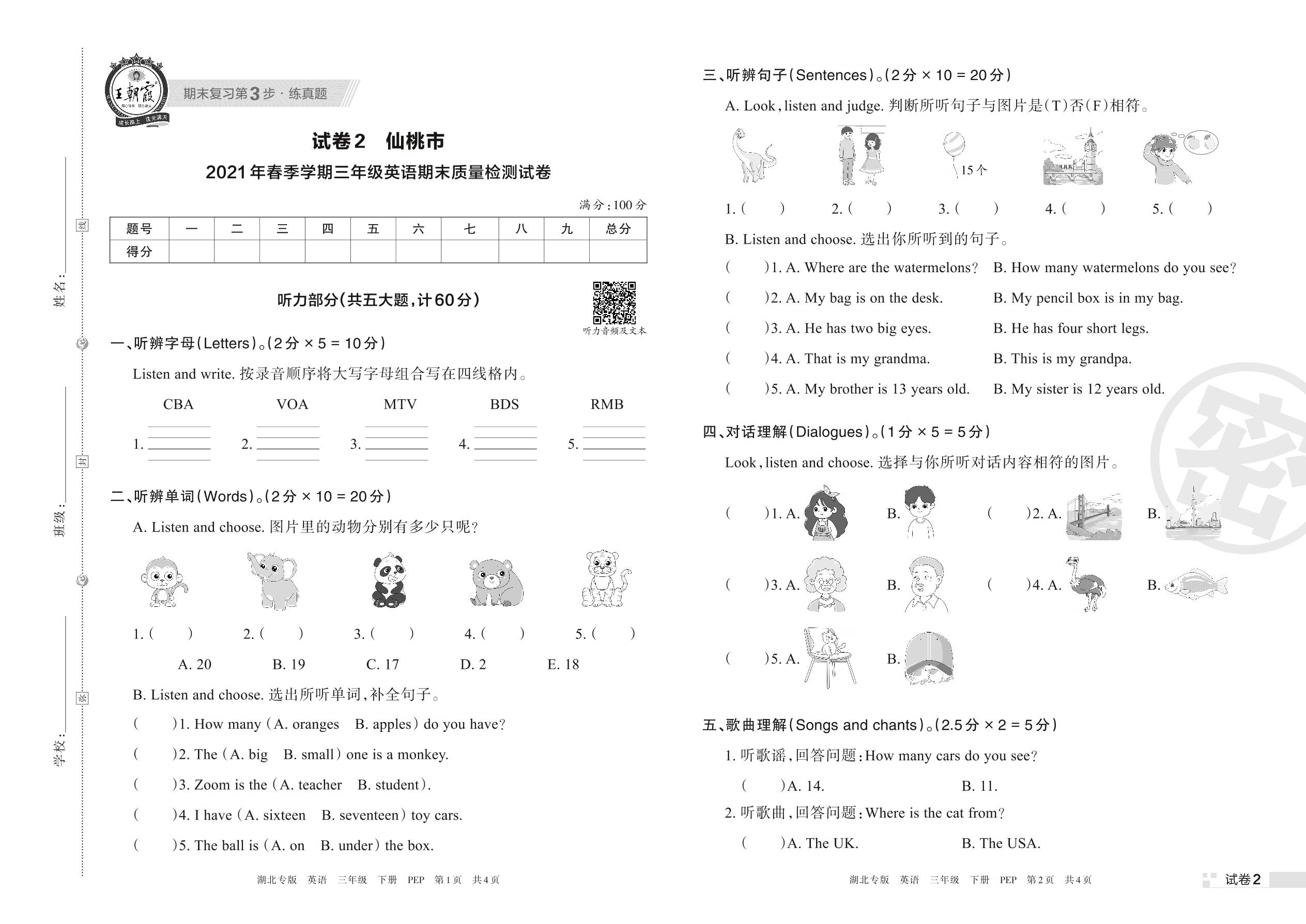 仙桃市2021年春季学期三年级英语期末质量检测试卷(PEP版)【2】