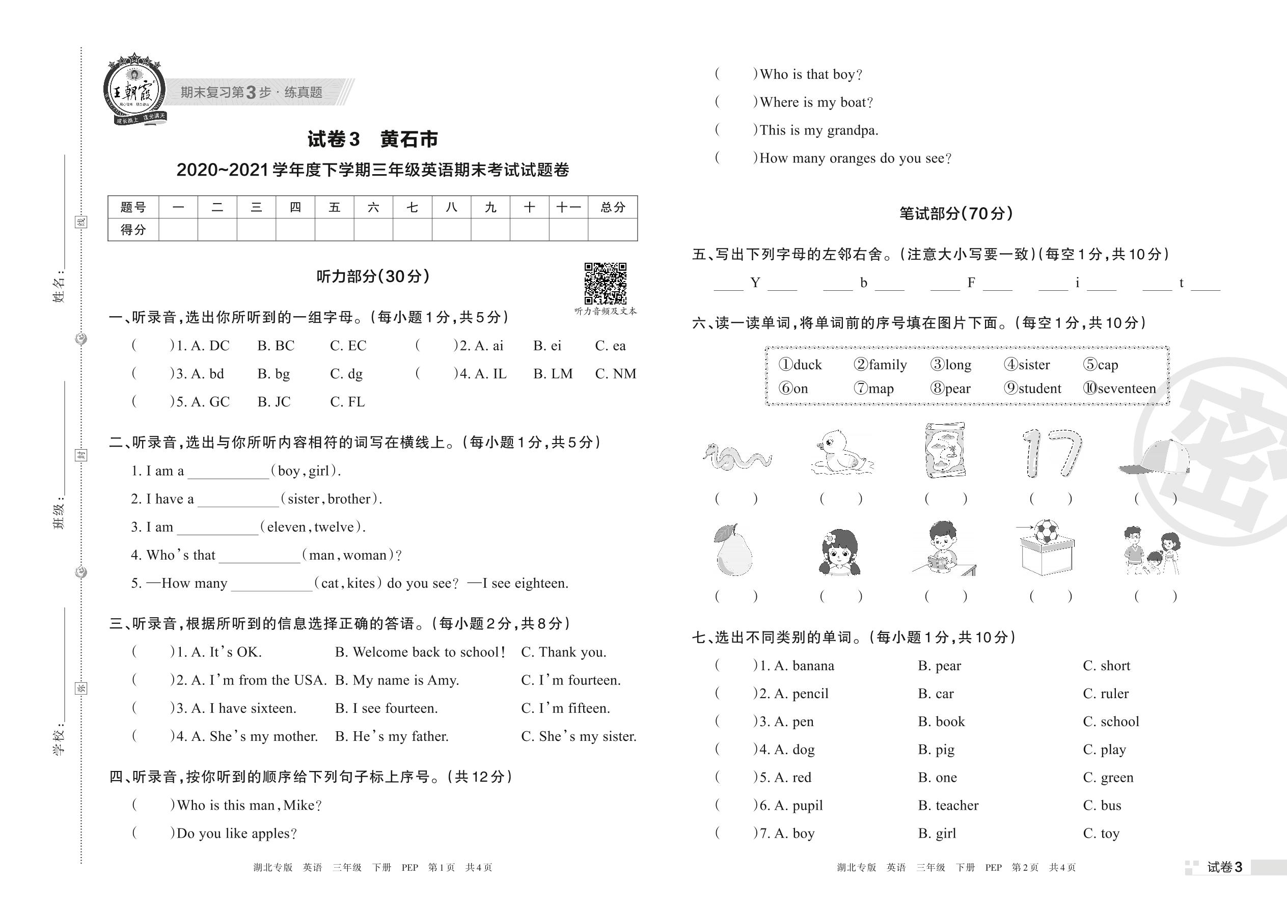 黄石市2020~2021学年度下学期三年级英语期末考试试题卷(PEP版)【3】