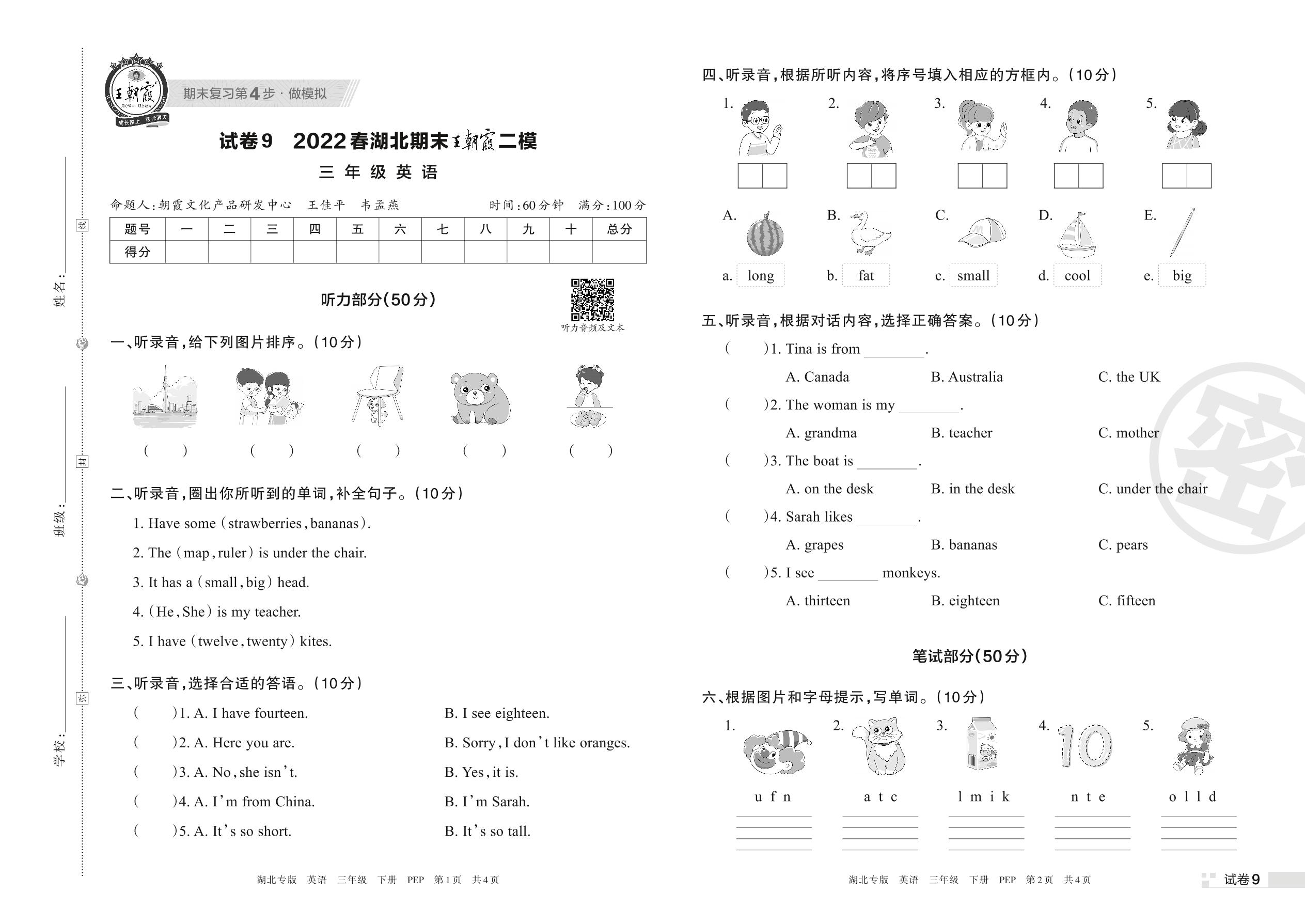 王朝霞期末模拟卷三年级下册英语(PEP版)【9】