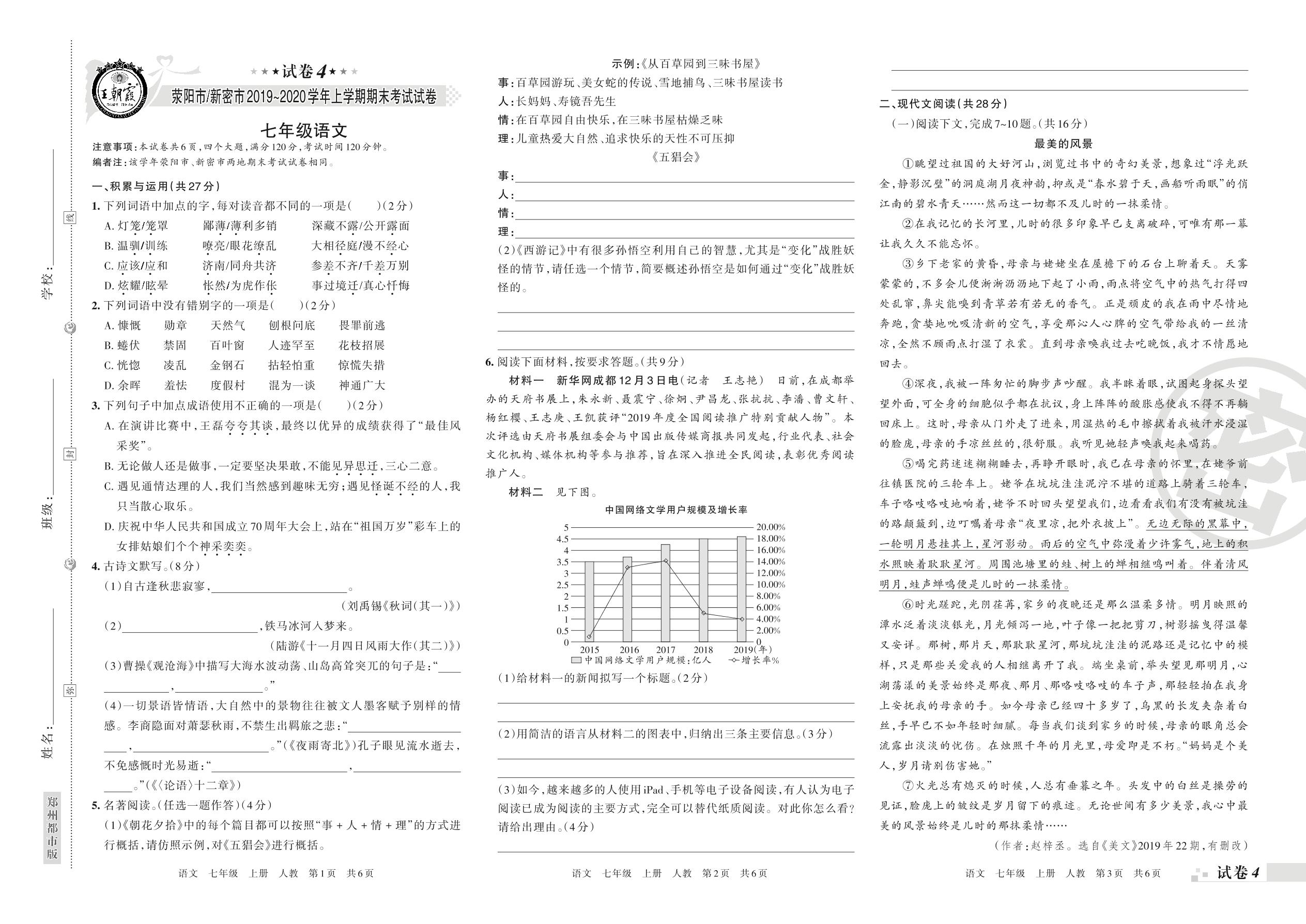 2019-2020学年第一学期荥阳市、新密市七年级语文试卷(人教版)【4】