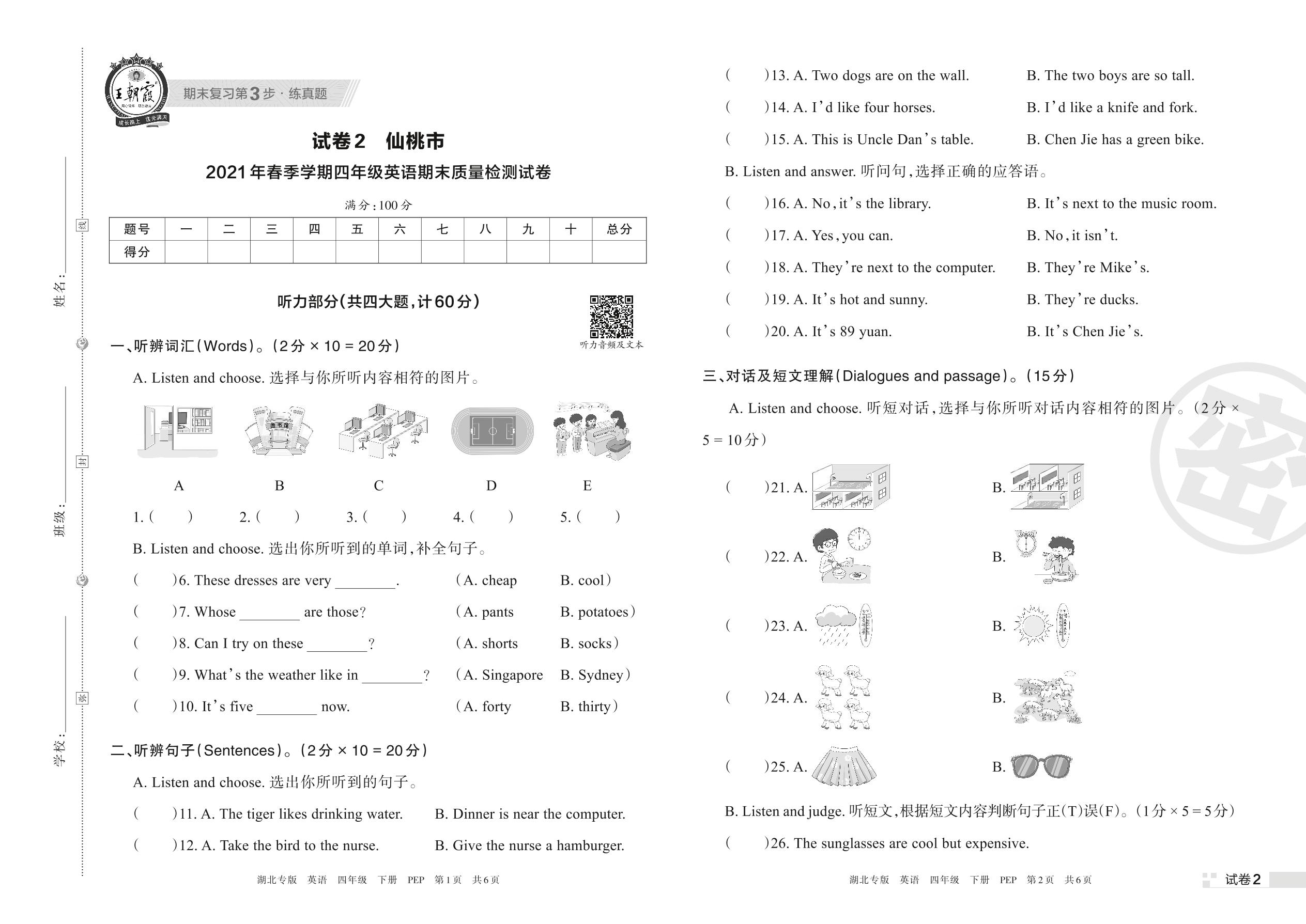 仙桃市2021年春季学期四年级英语期末质量检测试卷(PEP版)【2】