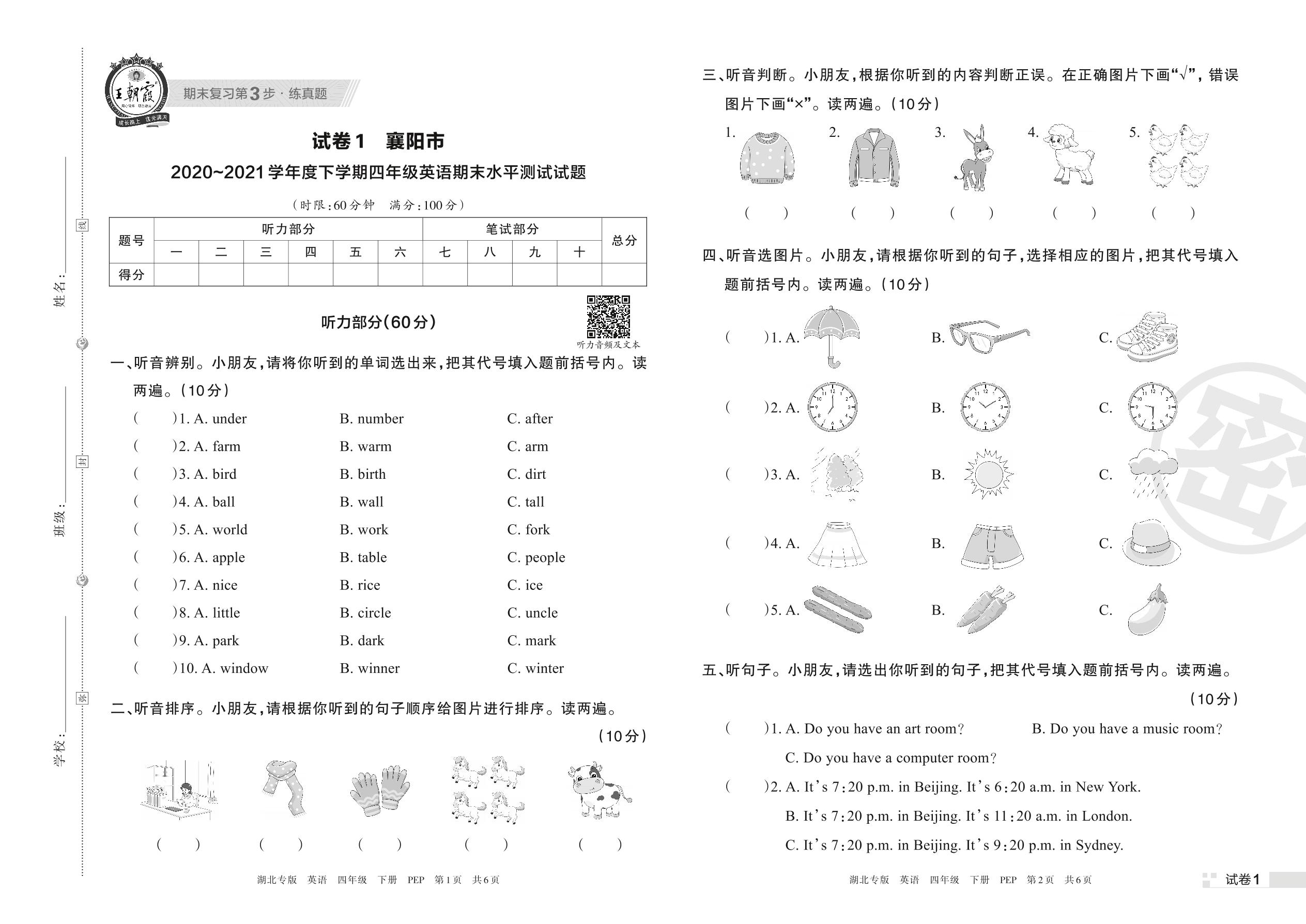 襄阳市2020~2021学年度下学期四年级英语期末水平测试试题(PEP版)【1】