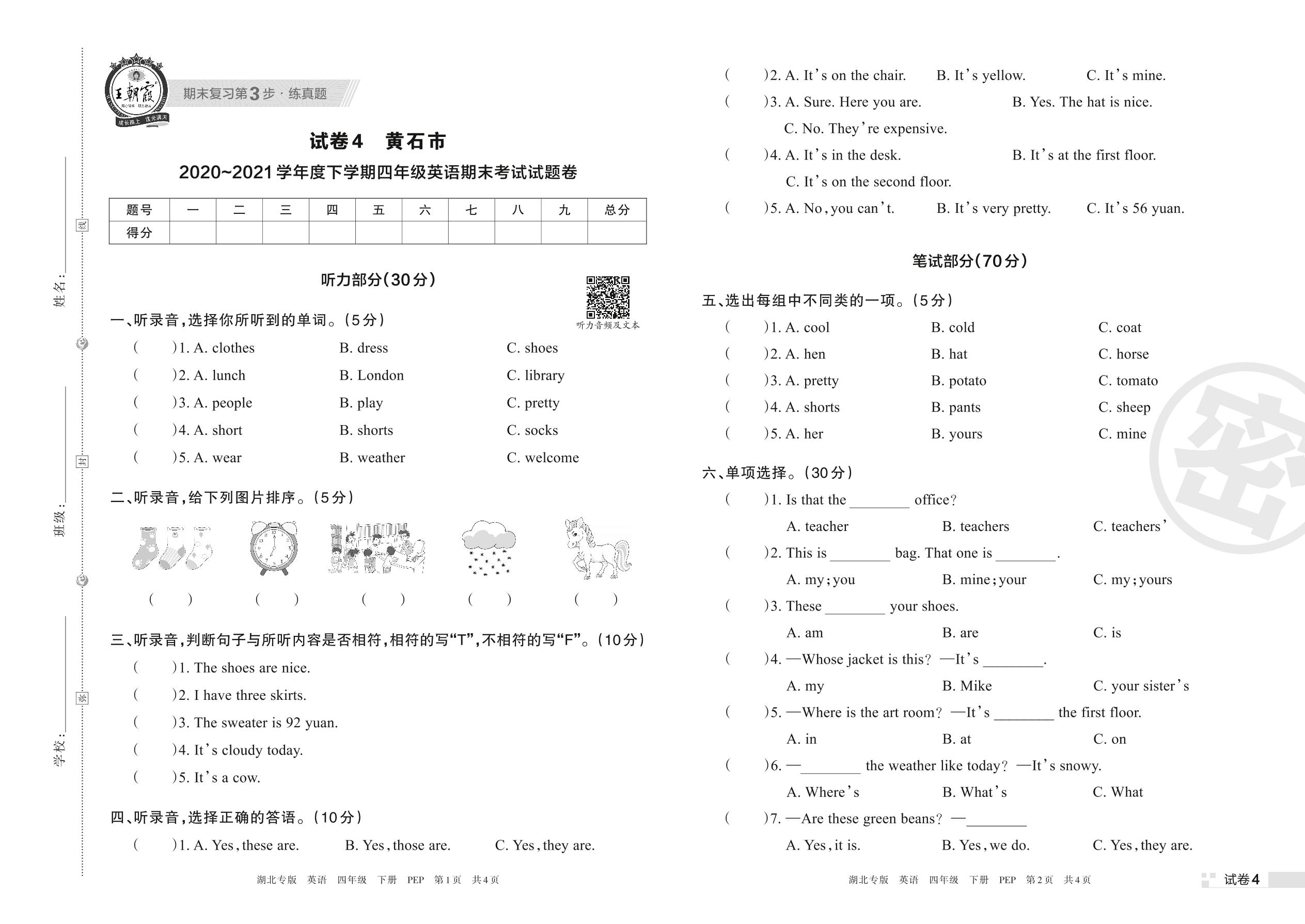 黄石市2020~2021学年度下学期四年级英语期末考试试题卷(PEP版)【4】