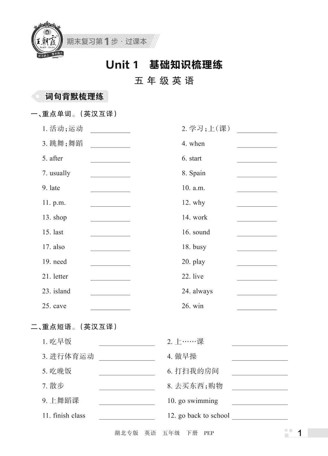 王朝霞期末过课本——Unit 1 基础知识梳理练五年级下册英语(PEP版)_R220328173211083