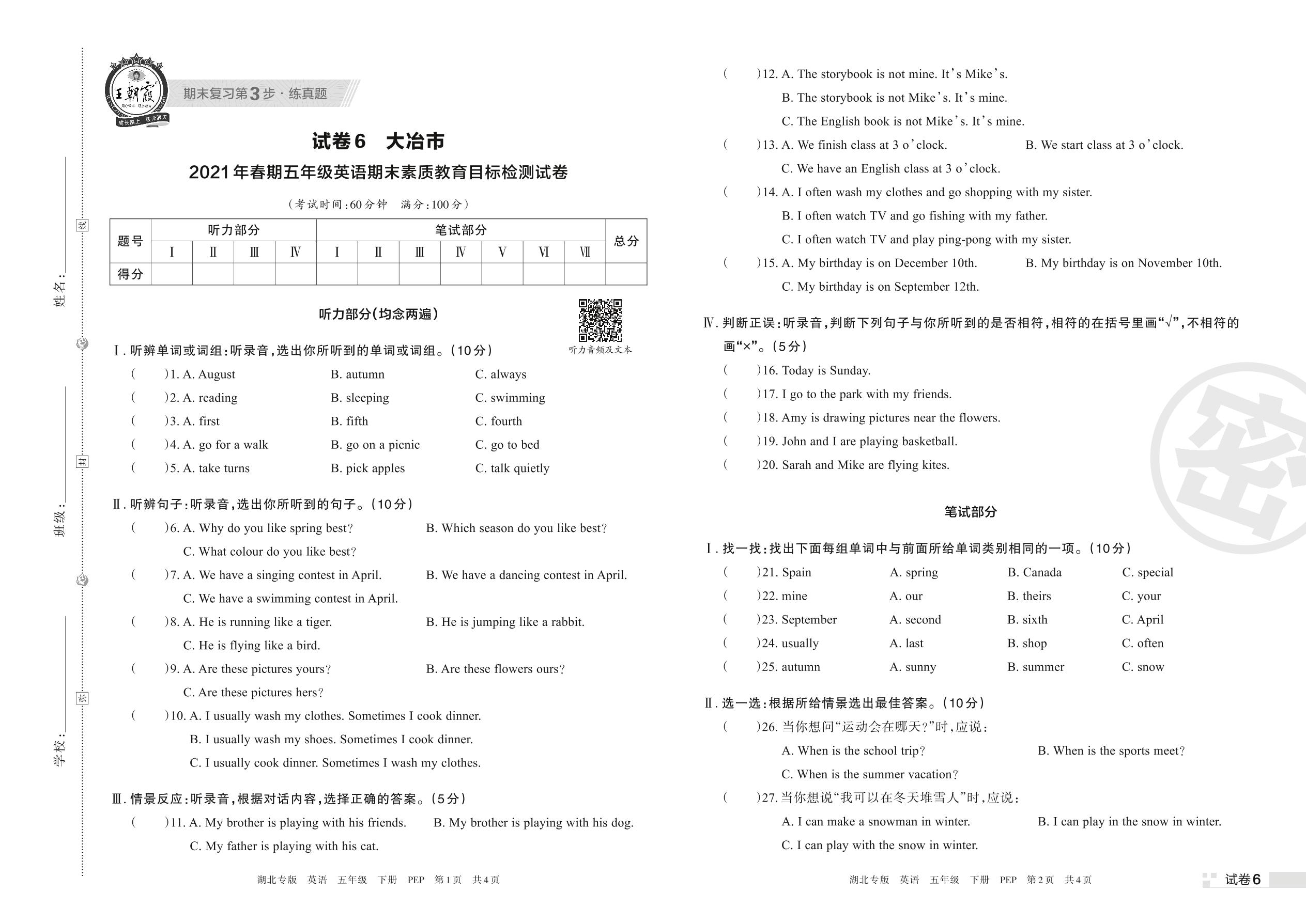 大冶市2021年春期五年级英语期末素质教育目标检测试卷(PEP版)【6】