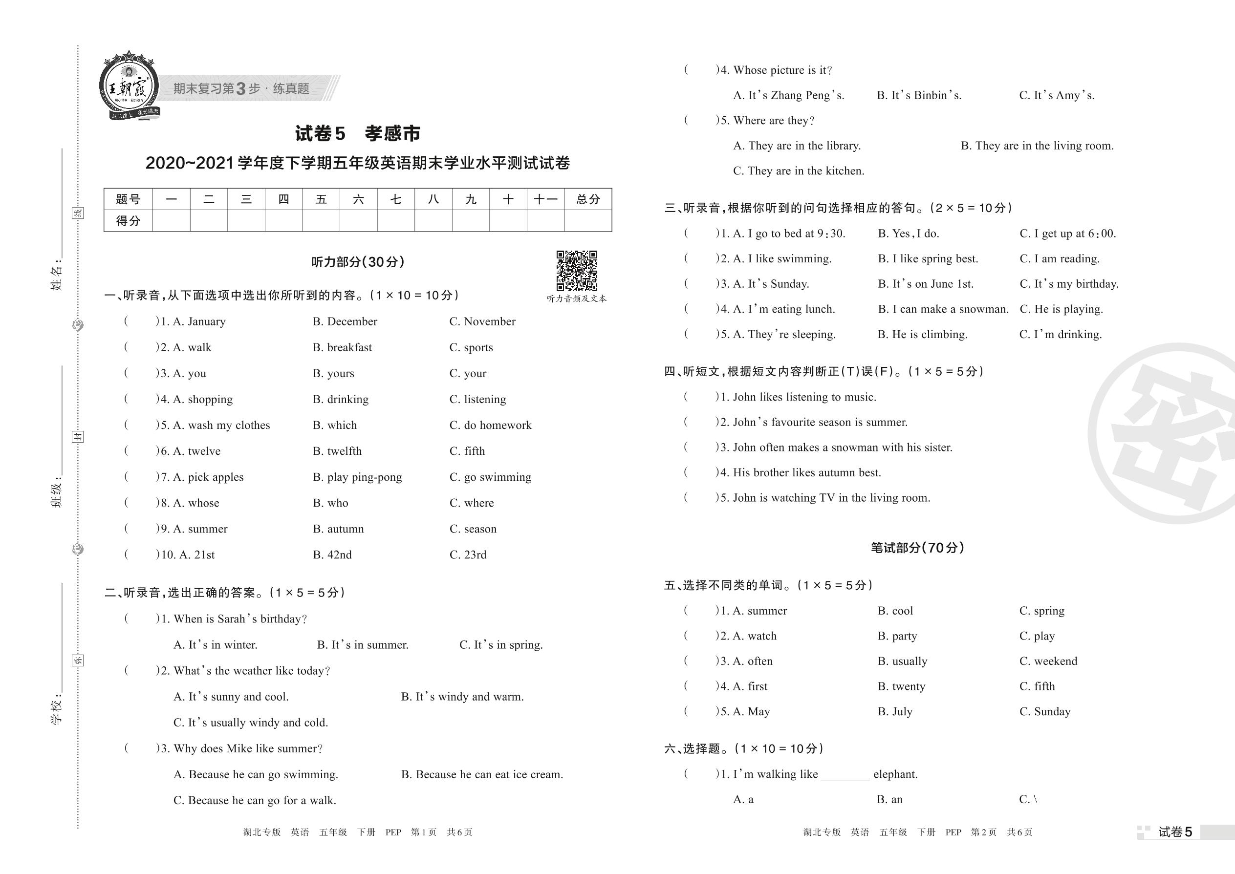 孝感市2020~2021学年度下学期五年级英语期末学业水平测试试卷(PEP版)【5】