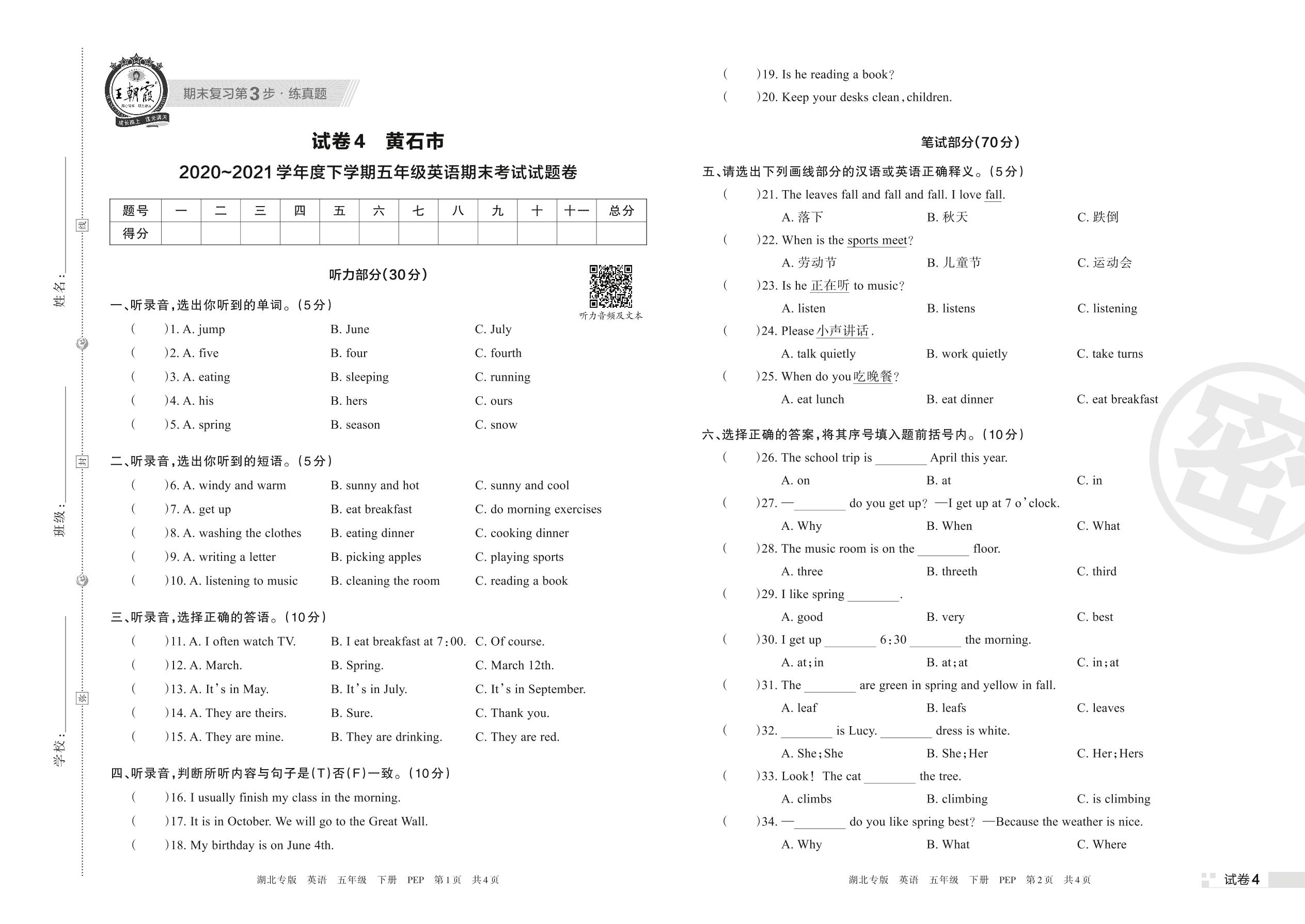 黄石市2020~2021学年度下学期五年级英语期末考试试题卷(PEP版)【4】