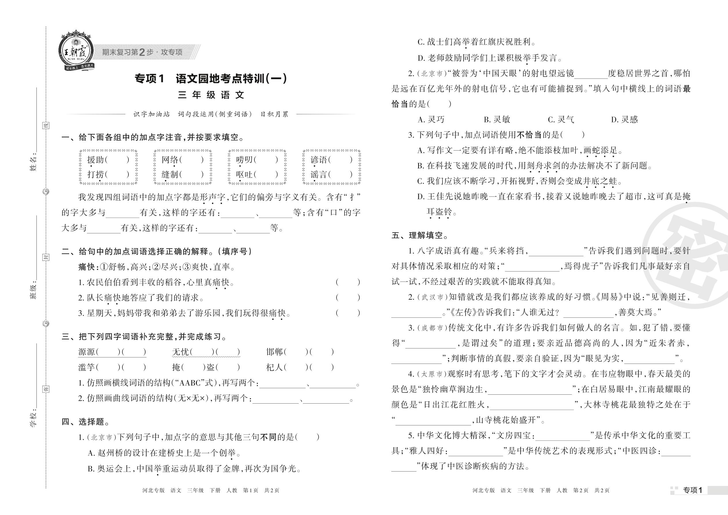 王朝霞期末专项卷——语文园地考点特训(一)三年级下册语文(人教版)_R220329091758045【1】