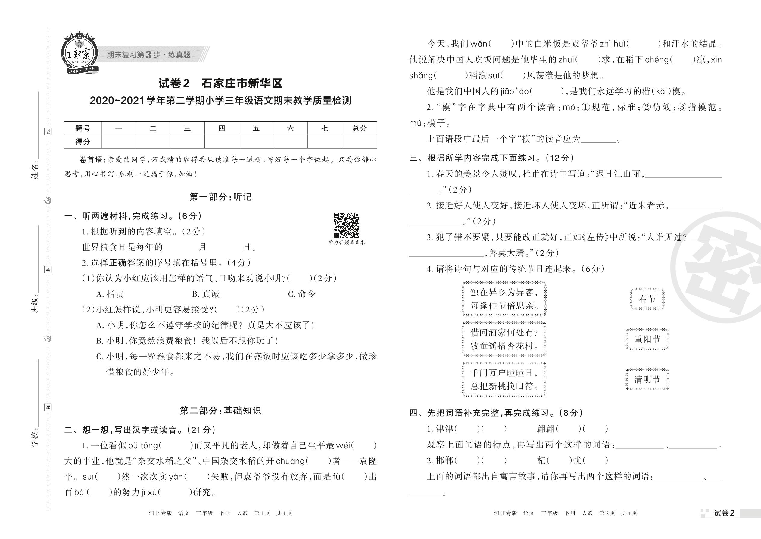 石家庄市新华区2020~2021学年第二学期小学三年级语文期末教学质量检测(人教版)【2】