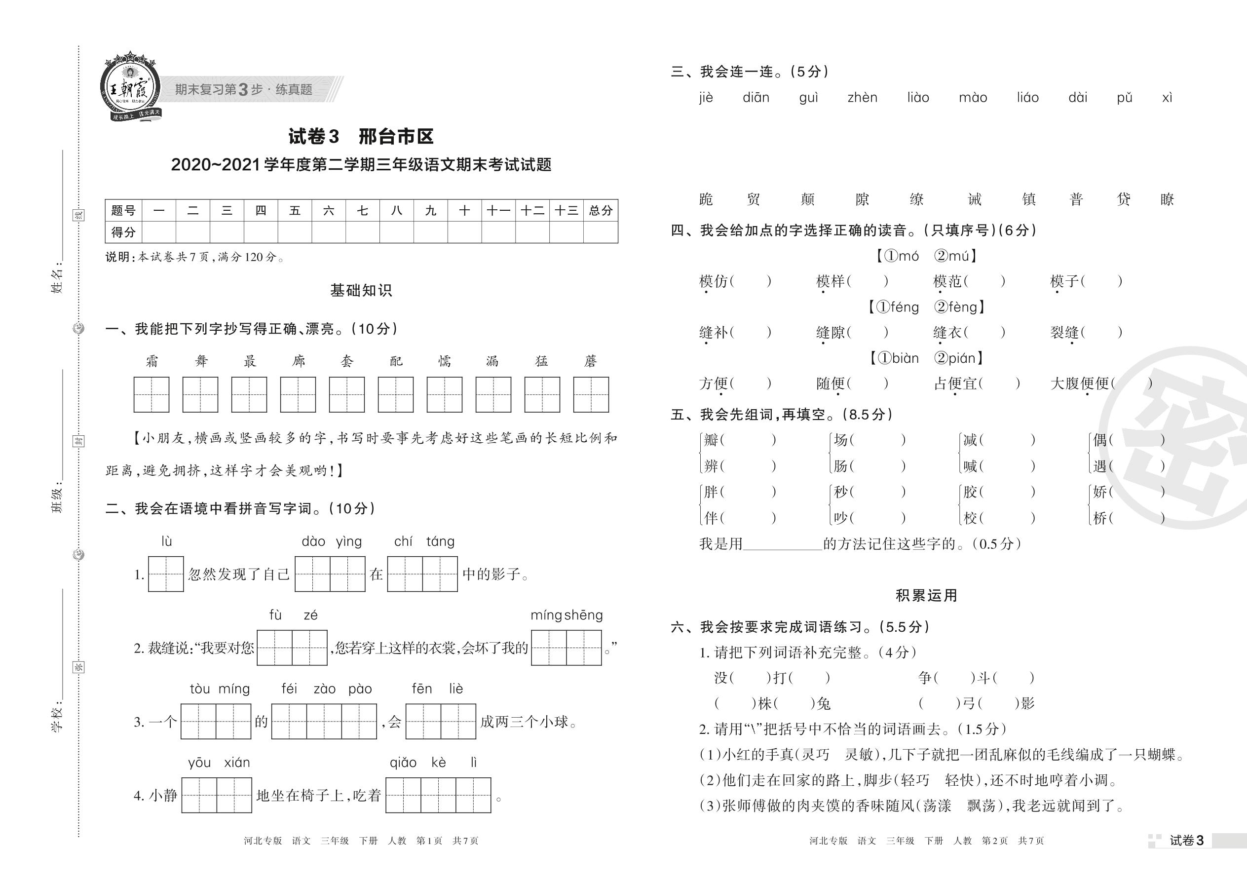 邢台市区2020~2021学年度第二学期三年级语文期末考试试题(人教版)【3】